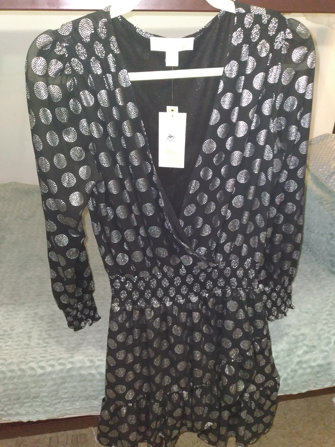 Selling a Michael Kors black dress in size M. It has a stylish design with silver polka dots and long sleeves. Perfect for any occasion!