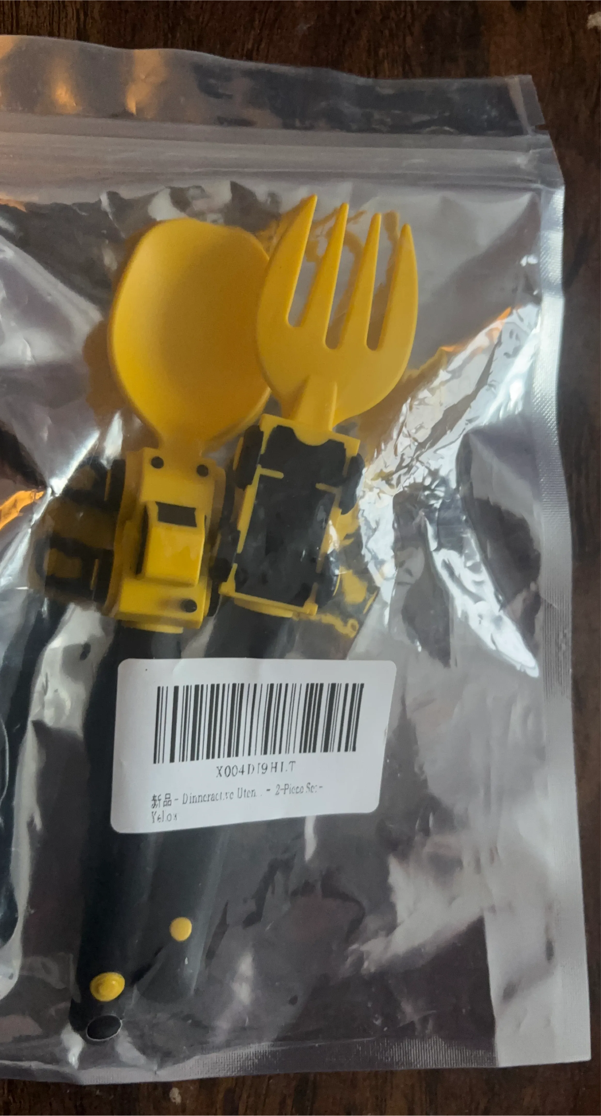 This is a 2-piece Dinneractive utensil set from Yelox. It's designed with a yellow scoop and fork with black handles. Perfect for little hands to learn to feed themselves!