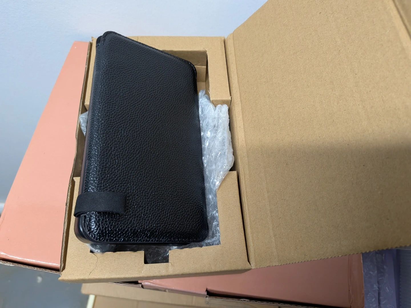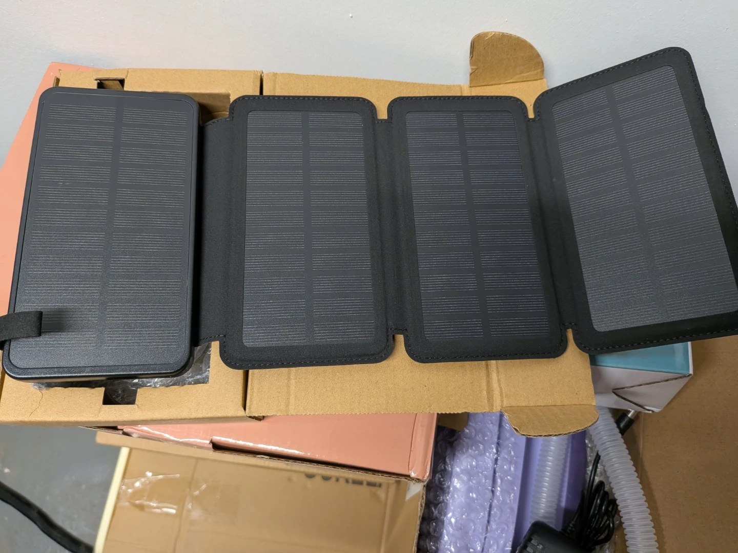 This portable solar charger features multiple solar panels for charging. It comes in a black case with a strap. It's great for outdoor adventures. Includes original box.