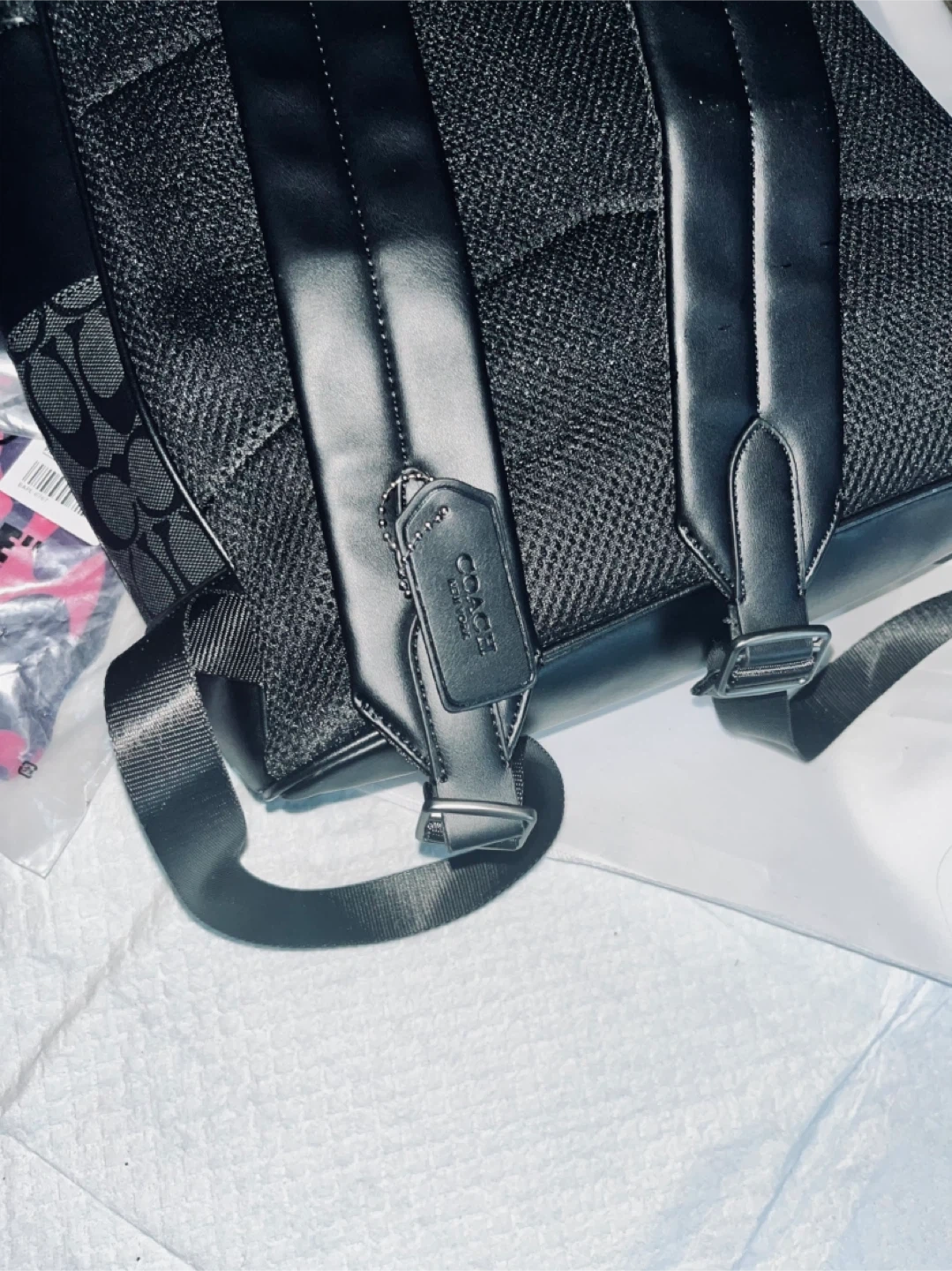 This is a black Coach backpack with the signature 'C' print. It features a front zip pocket and adjustable shoulder straps. Made with durable materials.