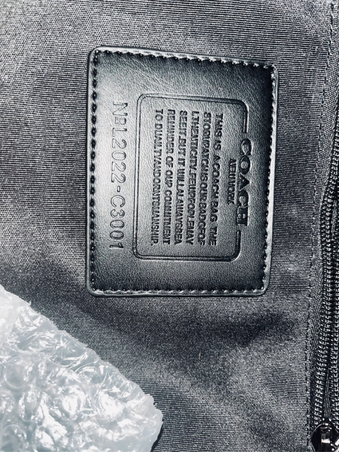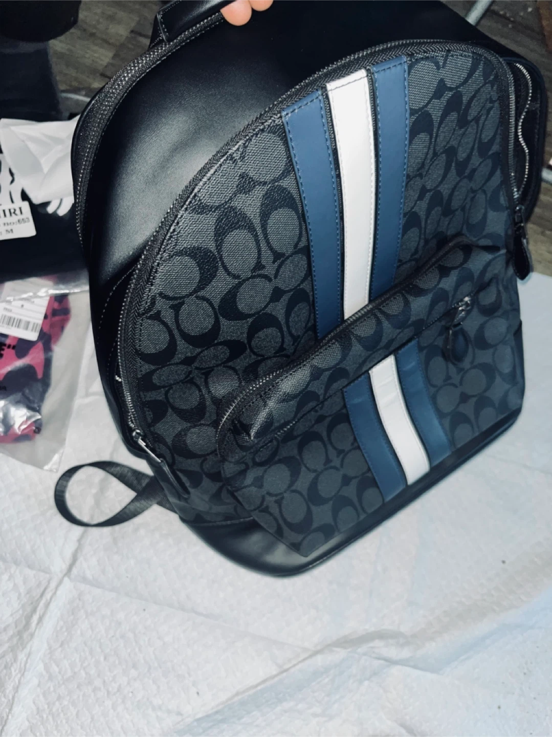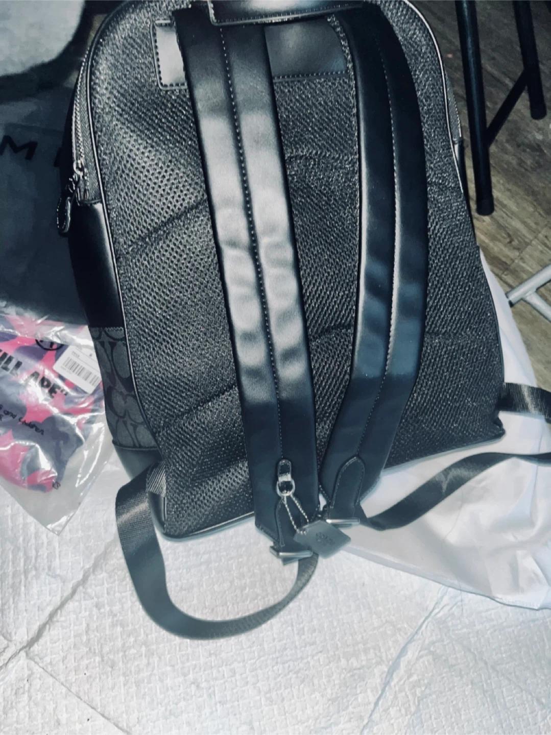 This is a black Coach backpack with the signature 'C' print. It features a front zip pocket and adjustable shoulder straps. Made with durable materials.