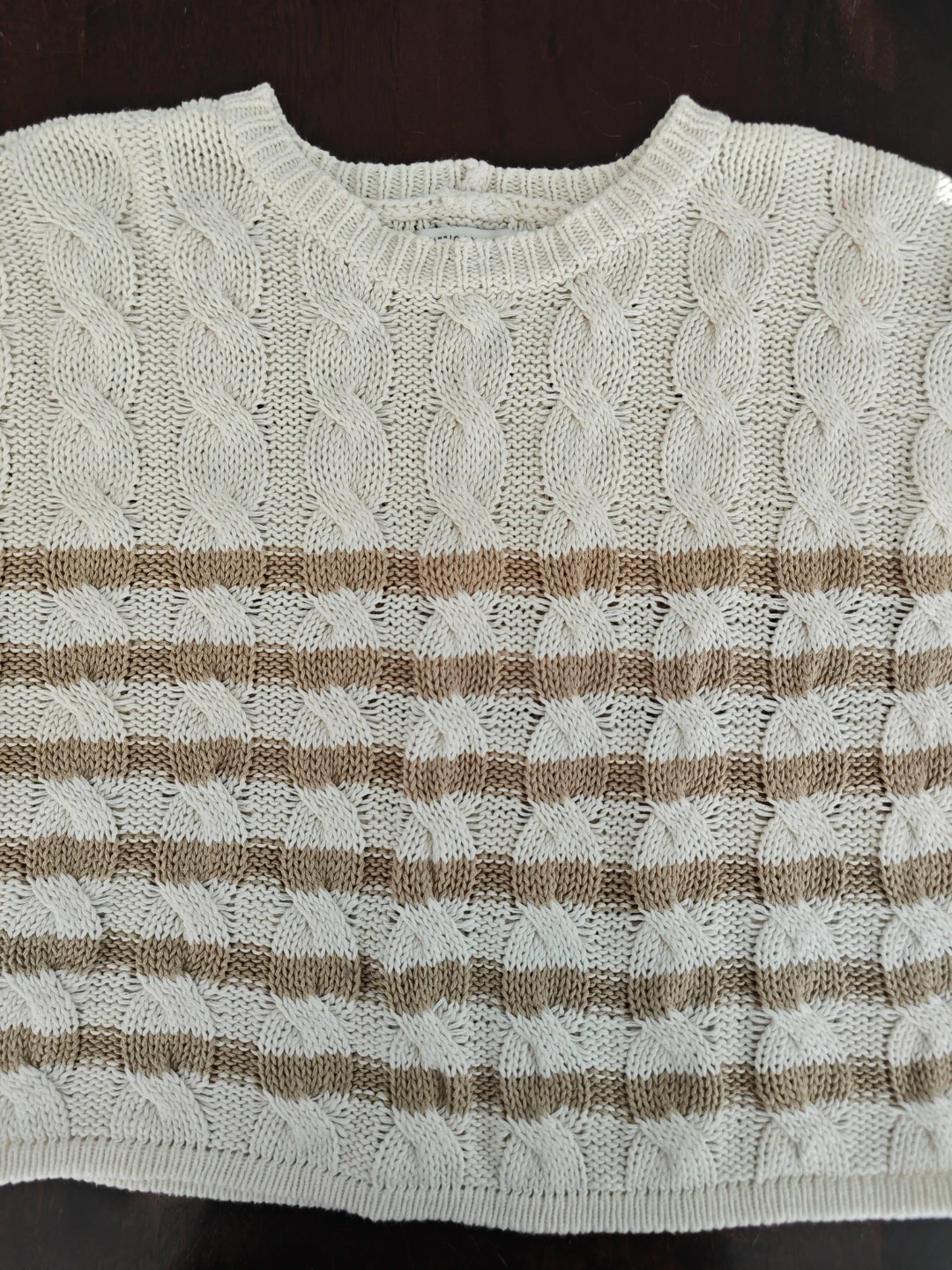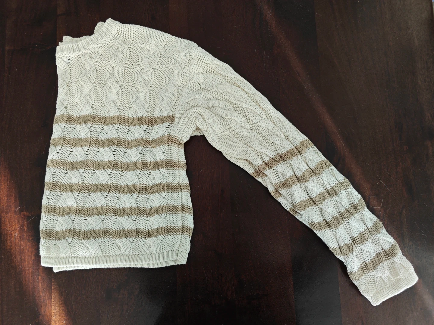 American Eagle cream sweater has brown horizontal stripes and a cable knit pattern. It's a long-sleeved crew neck style. Made from 100% cotton.