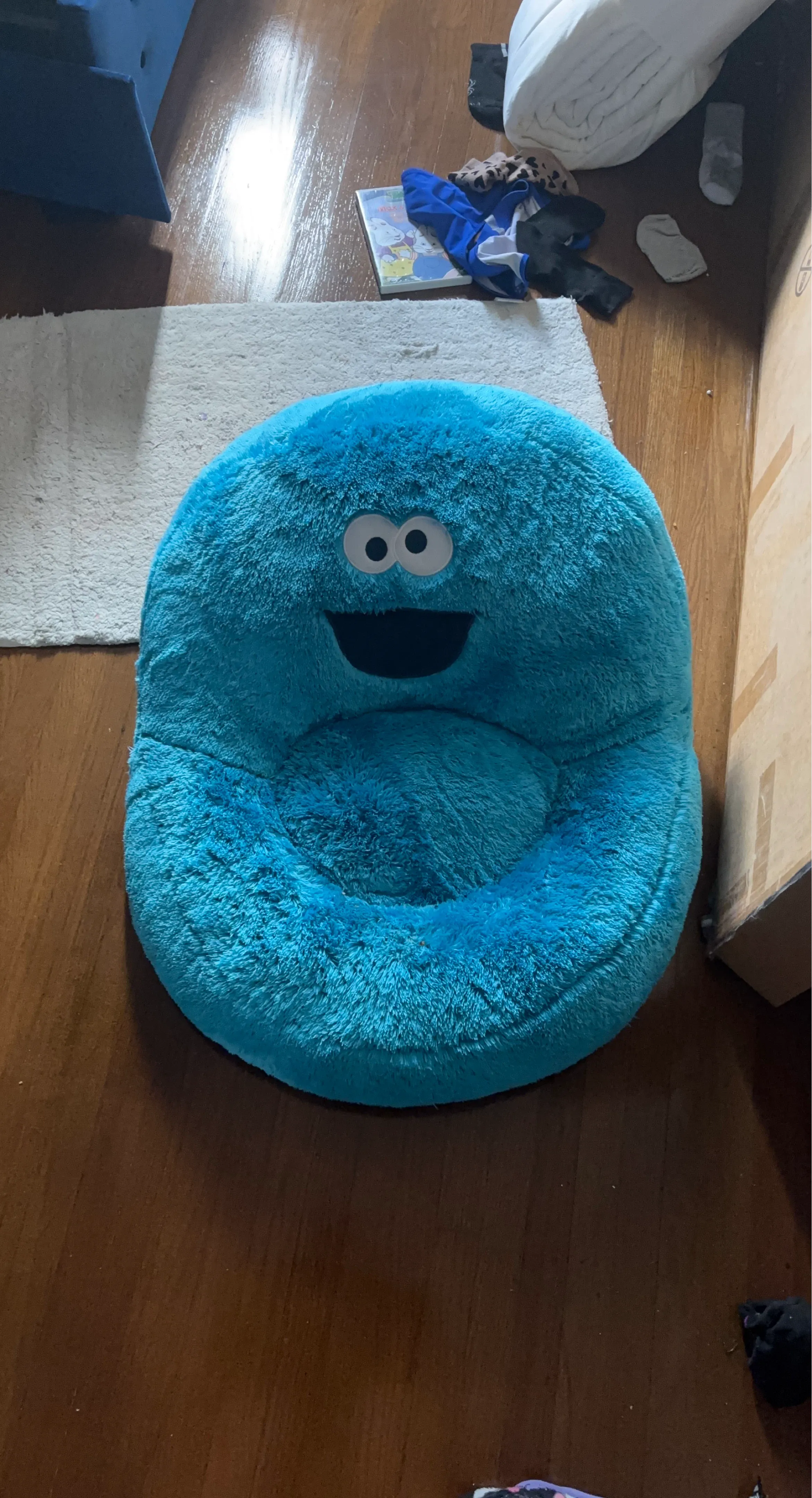 A fuzzy blue Cookie Monster bean bag chair. Perfect for kids' rooms or as a fun accent piece! It's made of soft plush material.