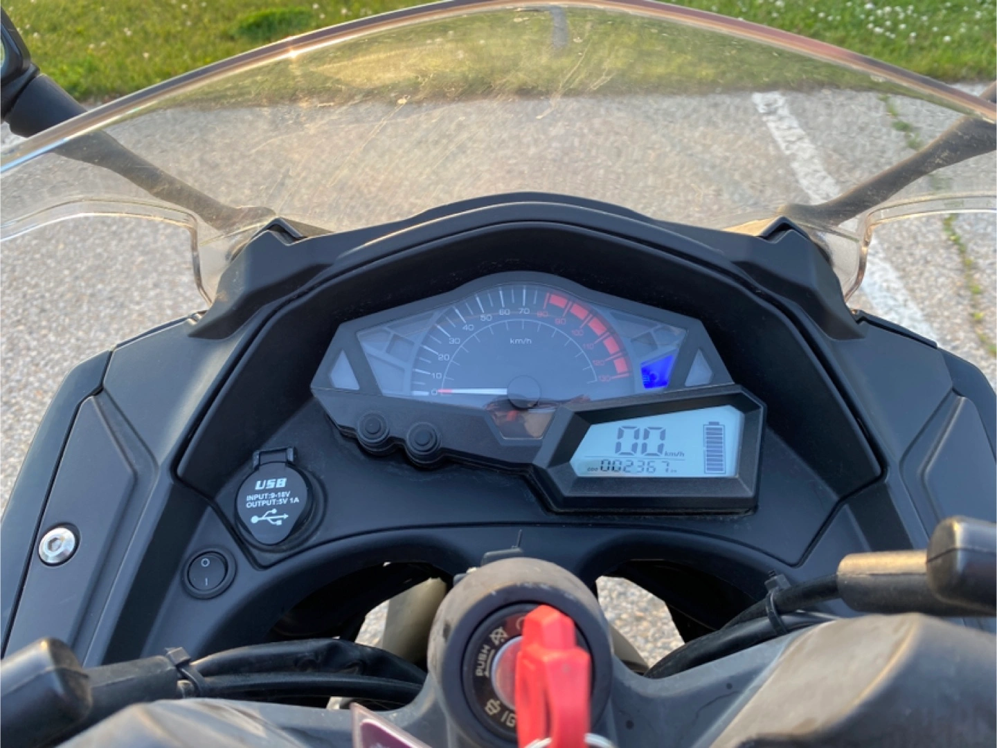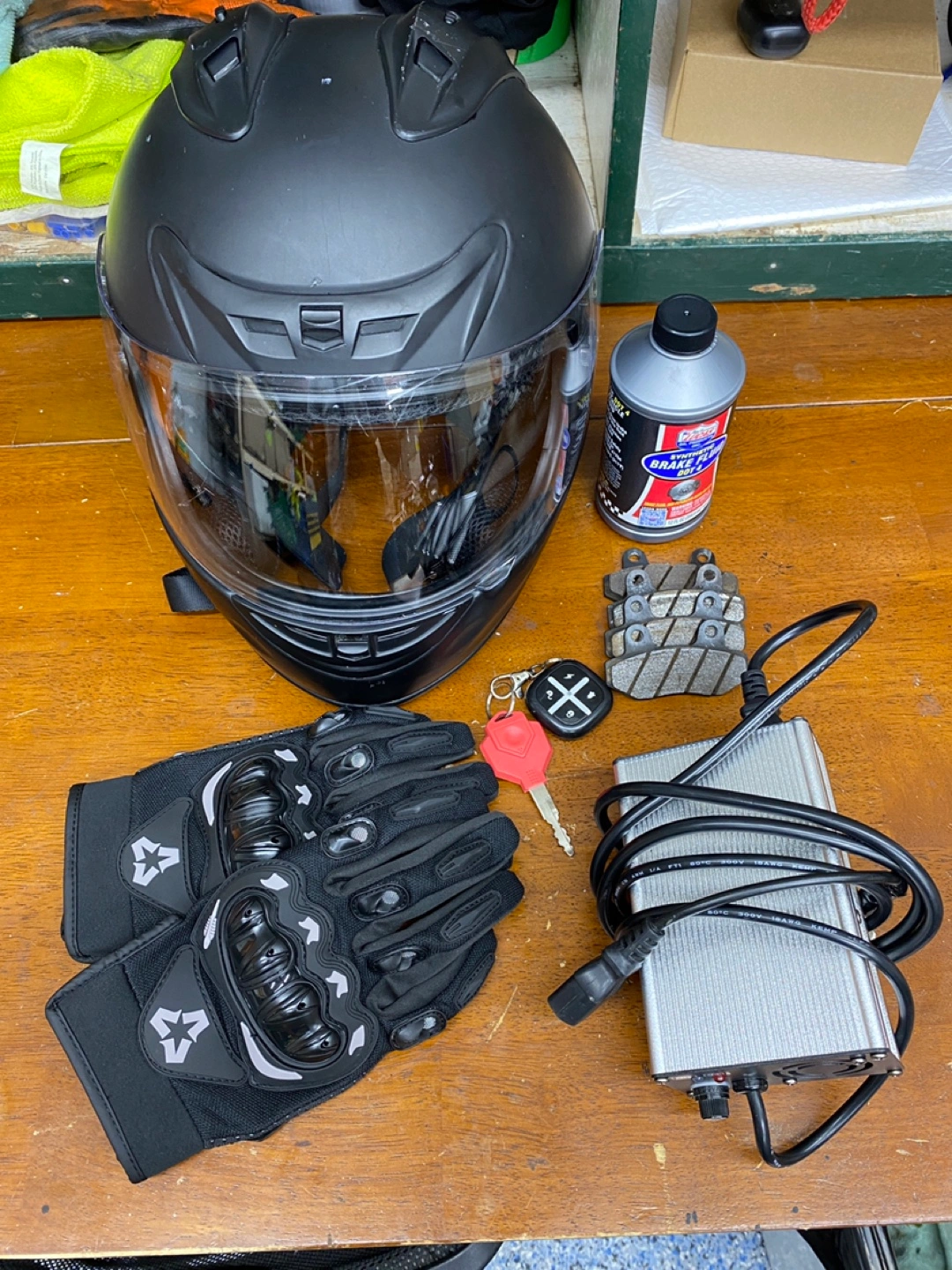 Sold with key+fob, motorcycle helmet and gloves, new lithium charger, extra brake pads and fluid, and a phone holder.