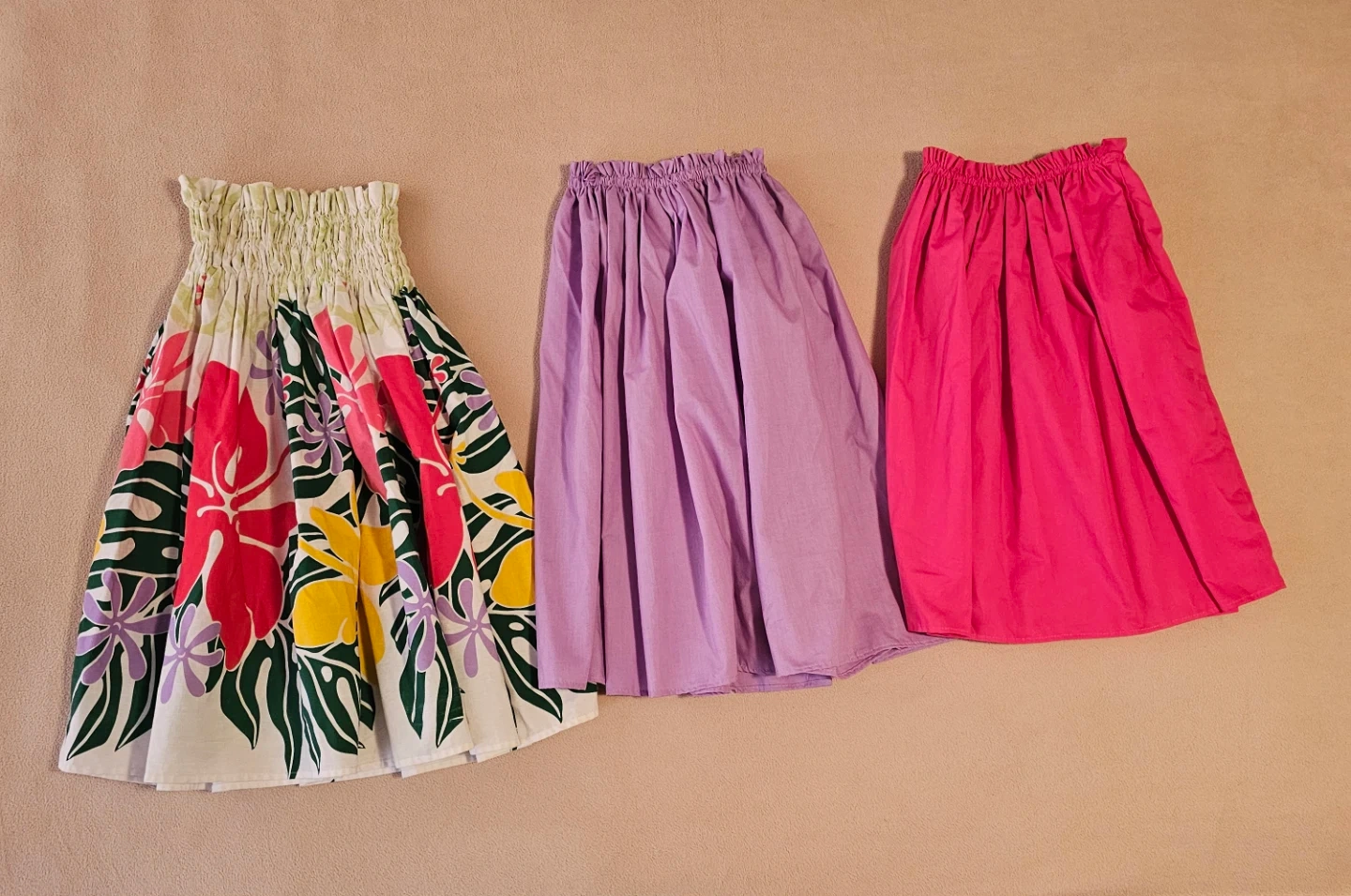 Bundle of 3 skirts, vibrant floral print, bright pink, and lavender. Lovingly handmade by community Moms for their young children to dance local Polynesian performances. Elasticated waistband, lightweight fabric, perfect for warmer weather, casual wear. Lightly worn only for performances. Excellent Condition $5 for all 3 skirts