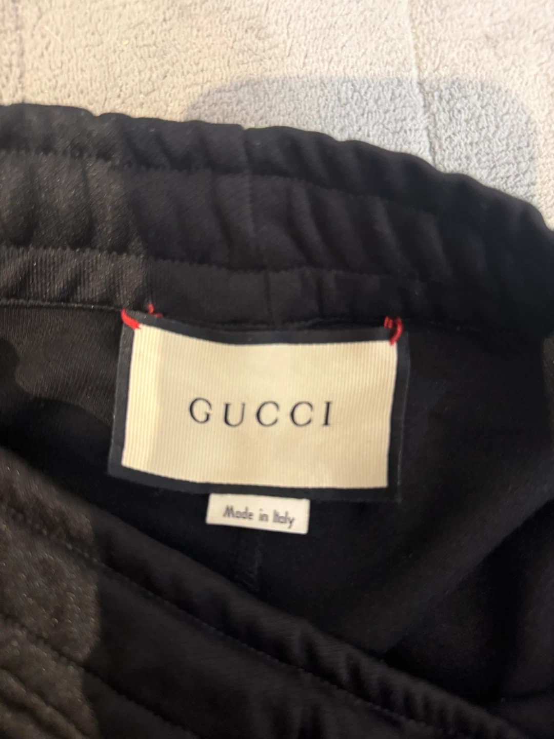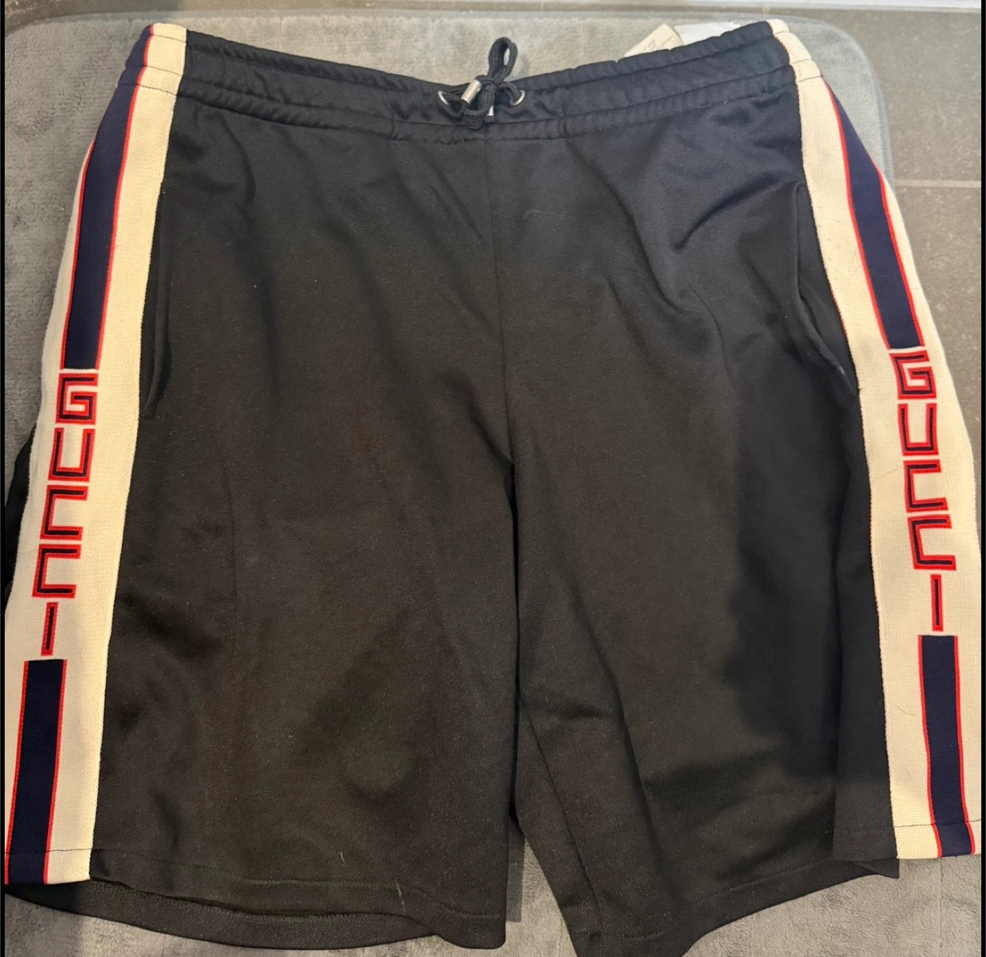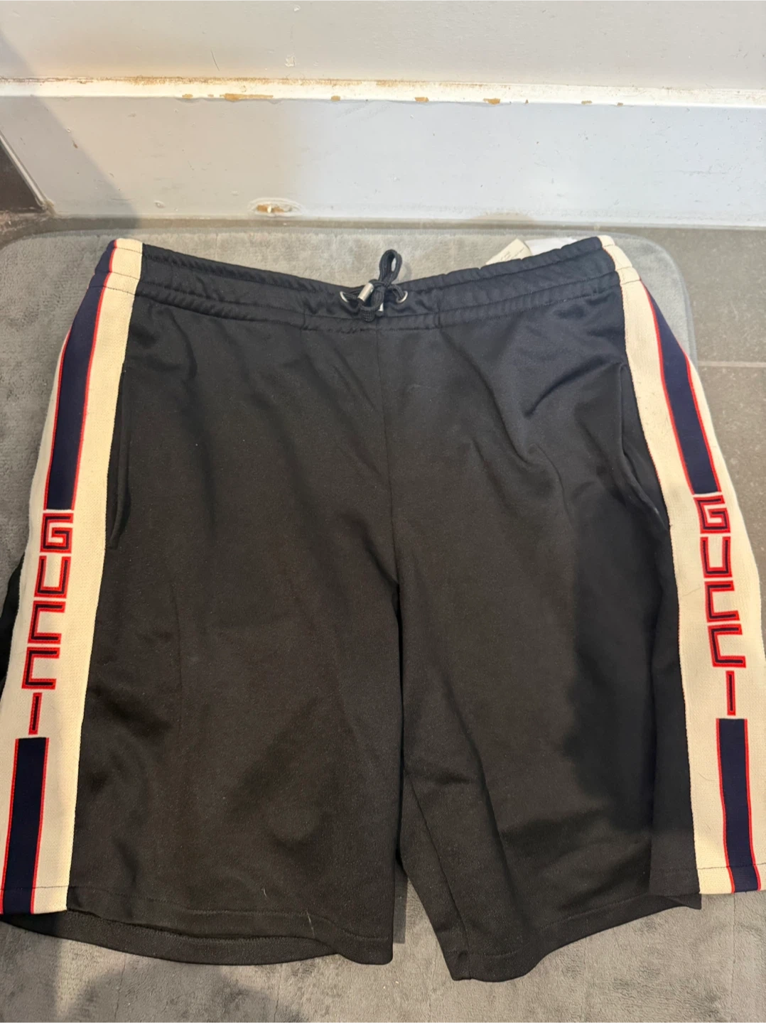 Black Gucci shorts with signature side stripe detail. Made in Italy. Comfortable and stylish for everyday wear.