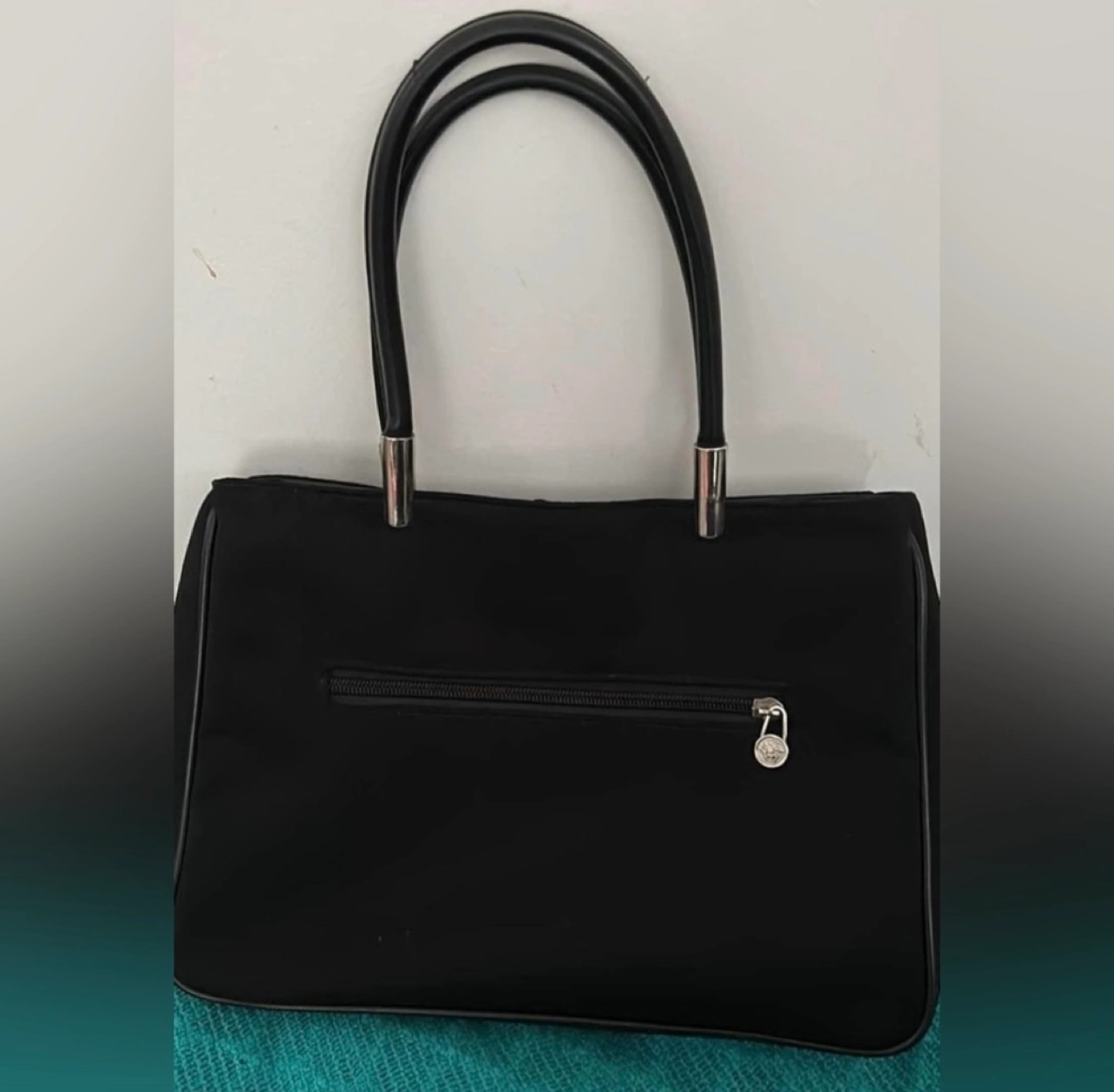 Black handbag with silver hardware. Double handles. Zipper closure. Interior zipper pocket.