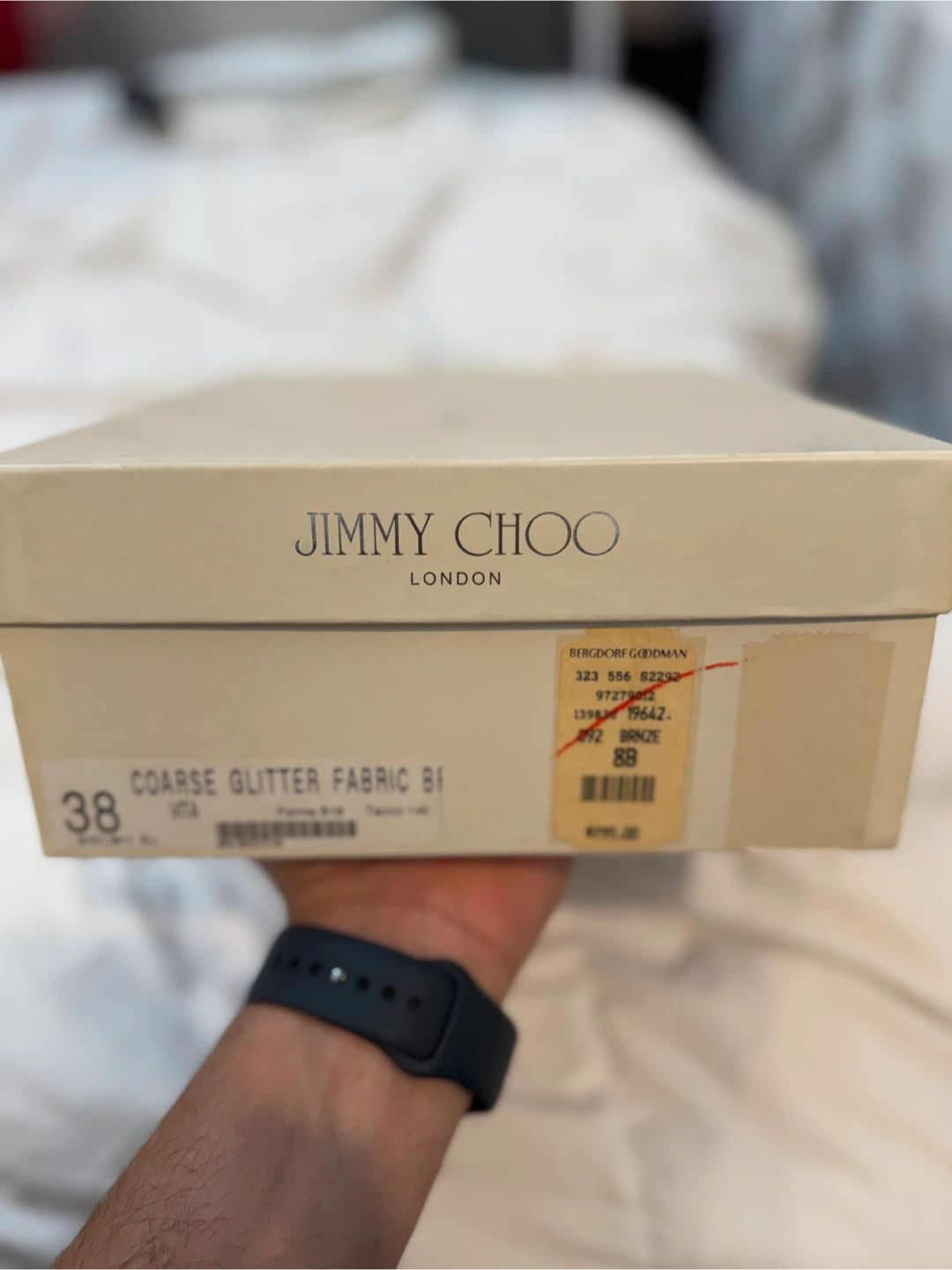 Selling a pair of Jimmy Choo heels in a beautiful bronze glitter fabric! These are a size 38 (US7.5) and come with the original box. Never worn or used. In excellent unworn condition. The original price was $795.00