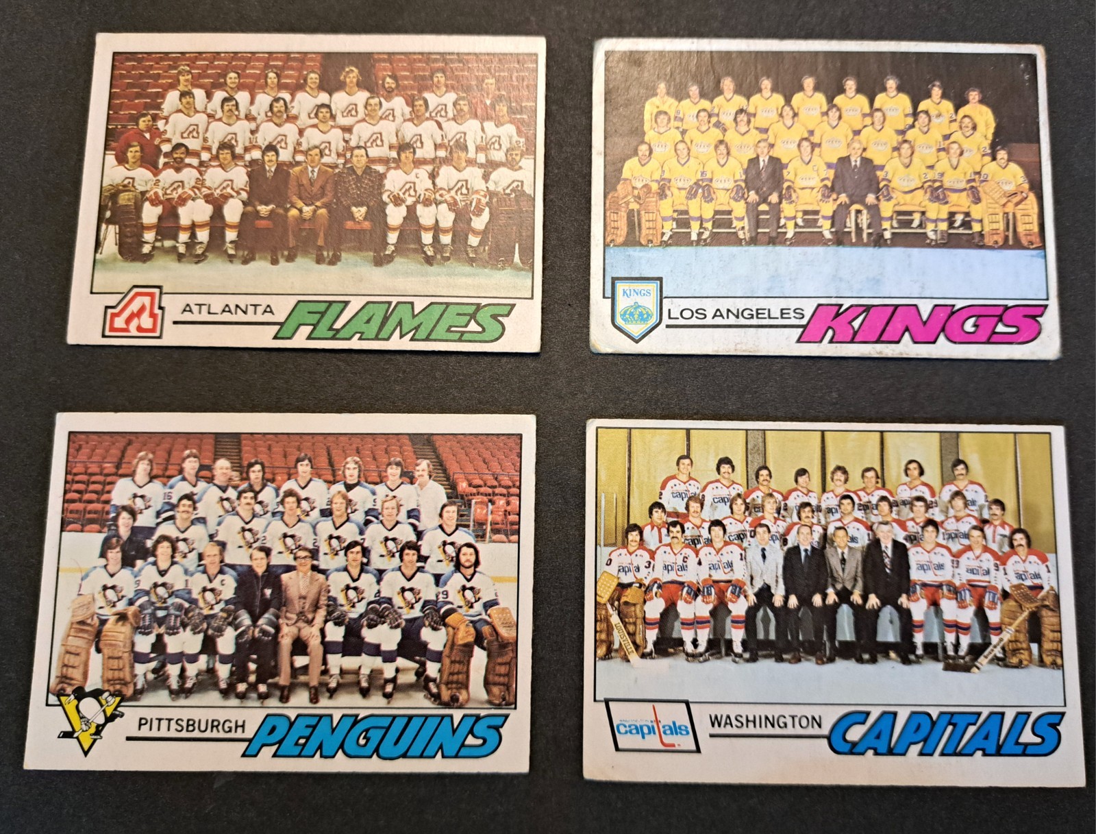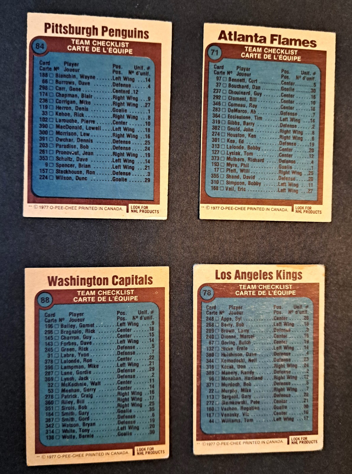 Ungraded - Excellent. 1977-78 O-Pee-Chee NHL Team Checklist cards for Atlanta Flames, Los Angeles Kings, Pittsburgh Penguins, and Washington Capitals. Card numbers 71, 78, 84, 88. Original O-Pee-Chee cards from Canada.