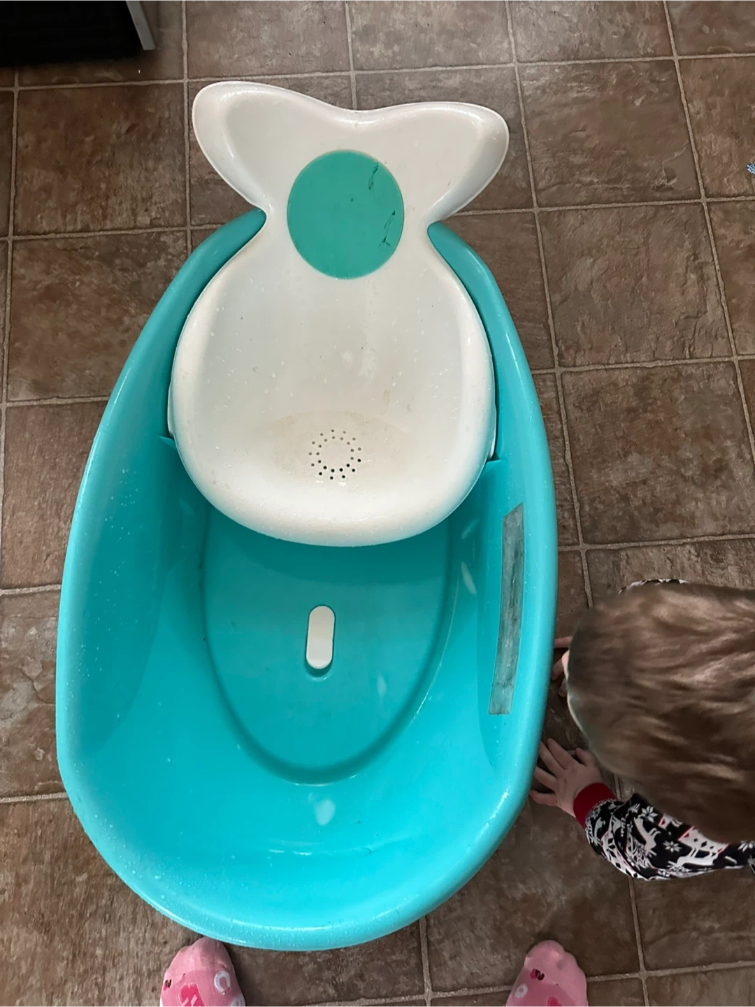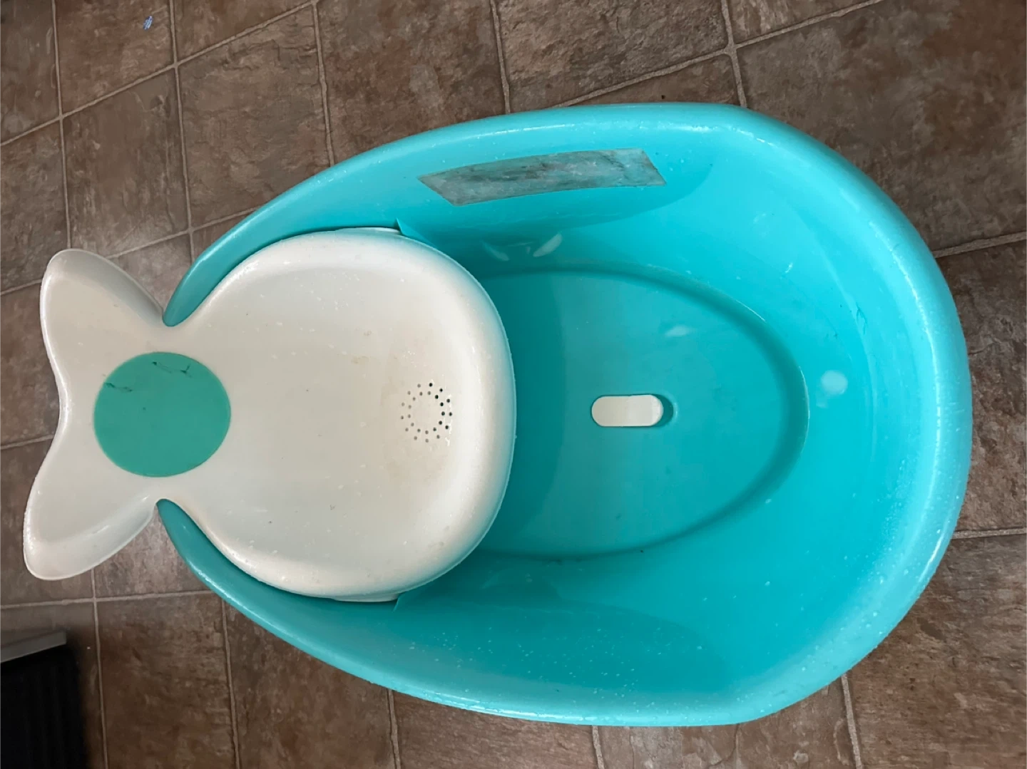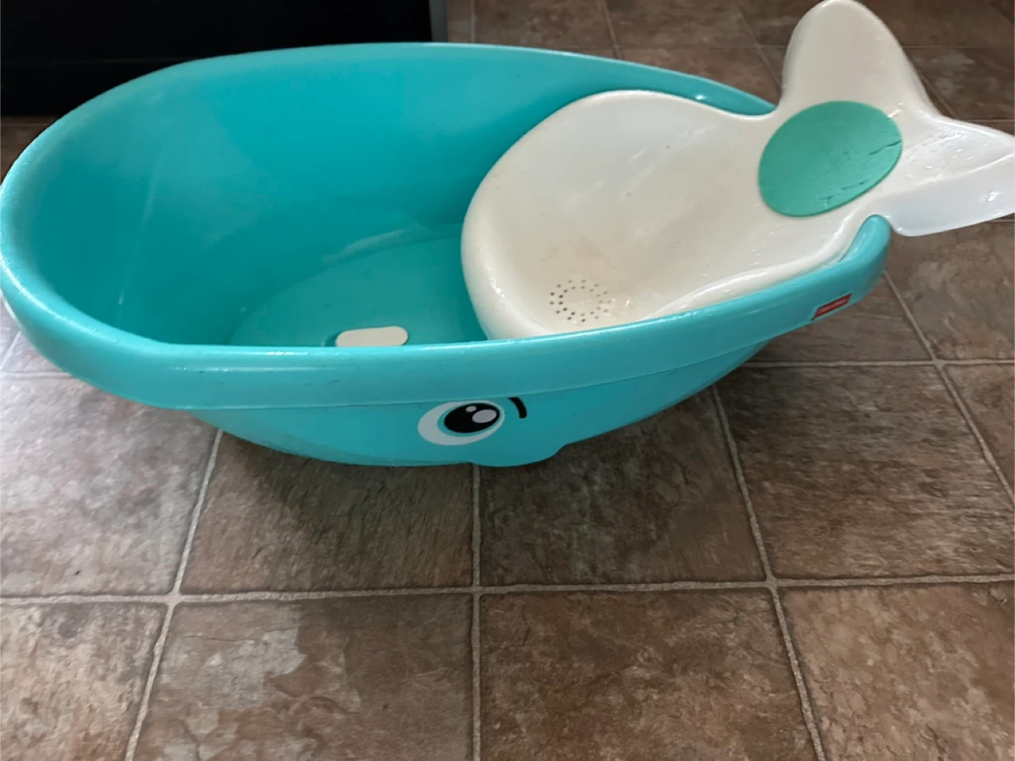 This Fisher-Price baby bathtub is designed like a whale for bath time fun. It features a comfortable insert for newborns and infants. The tub is made of durable plastic and is a bright teal colour.