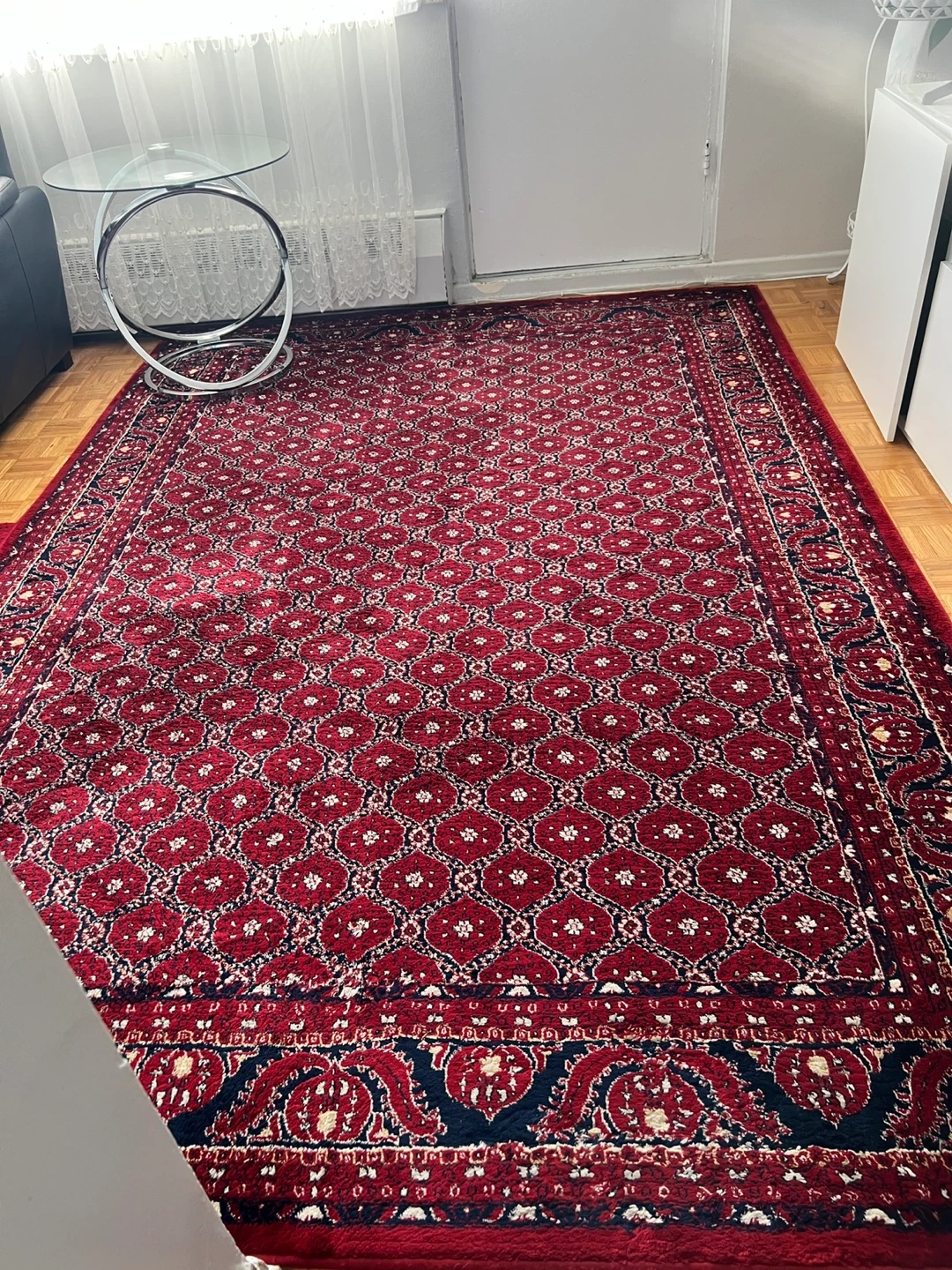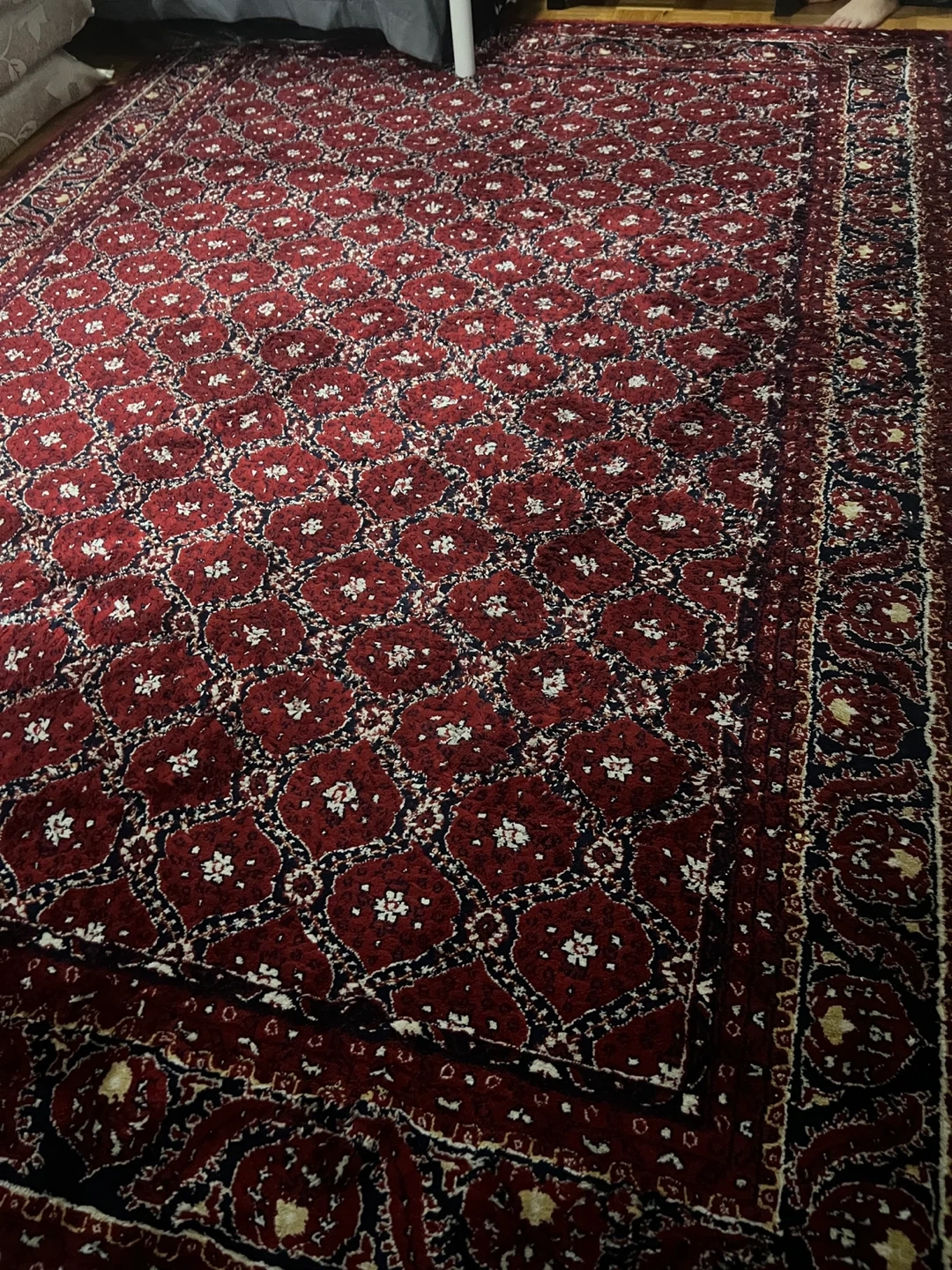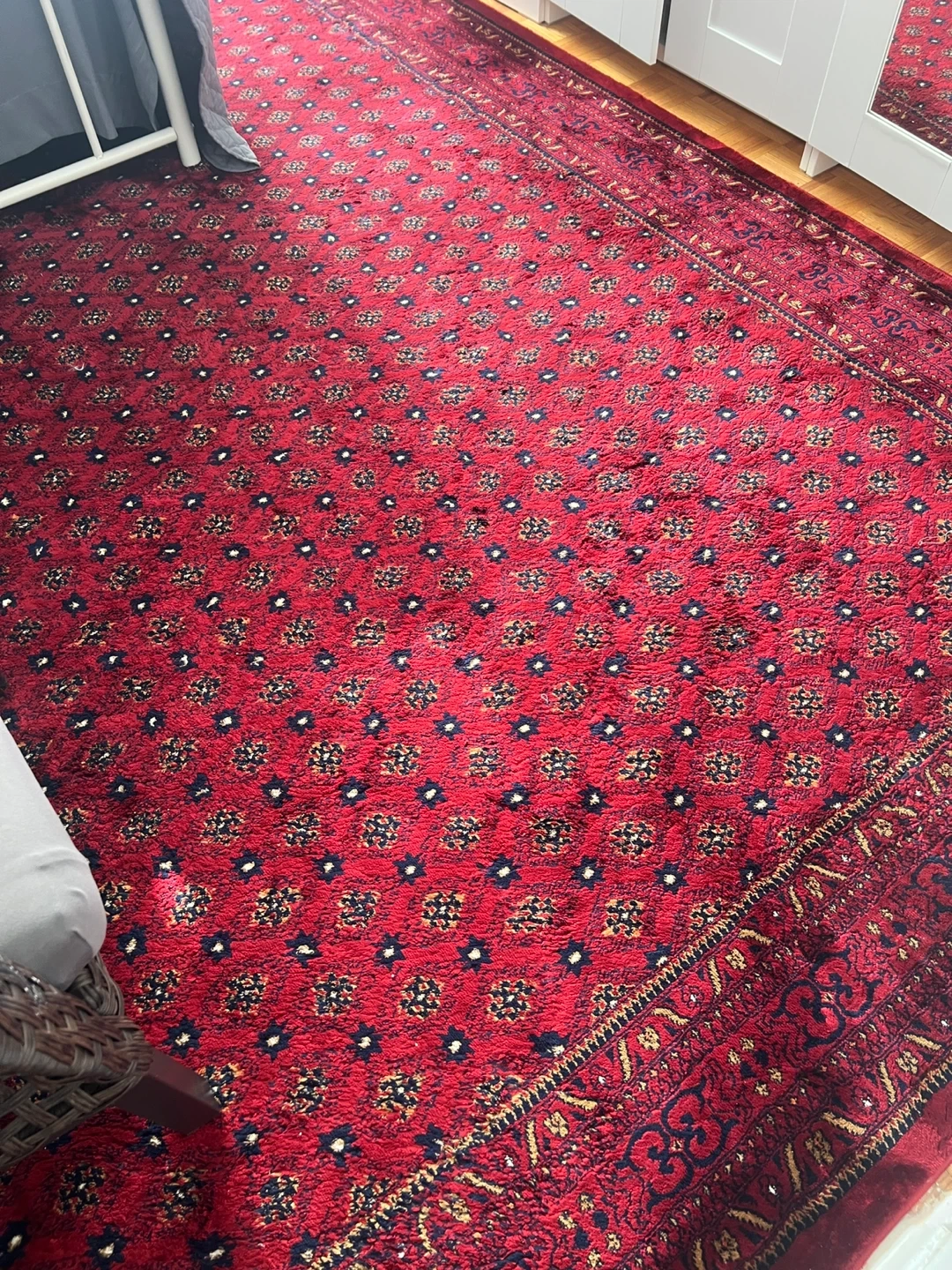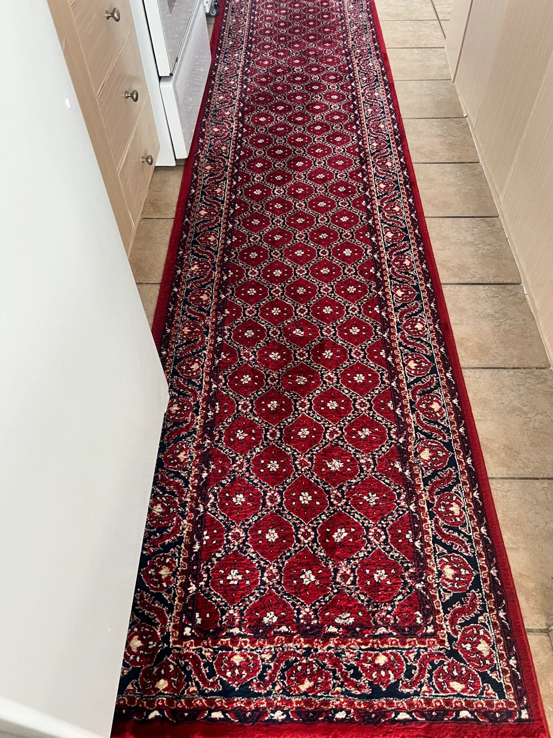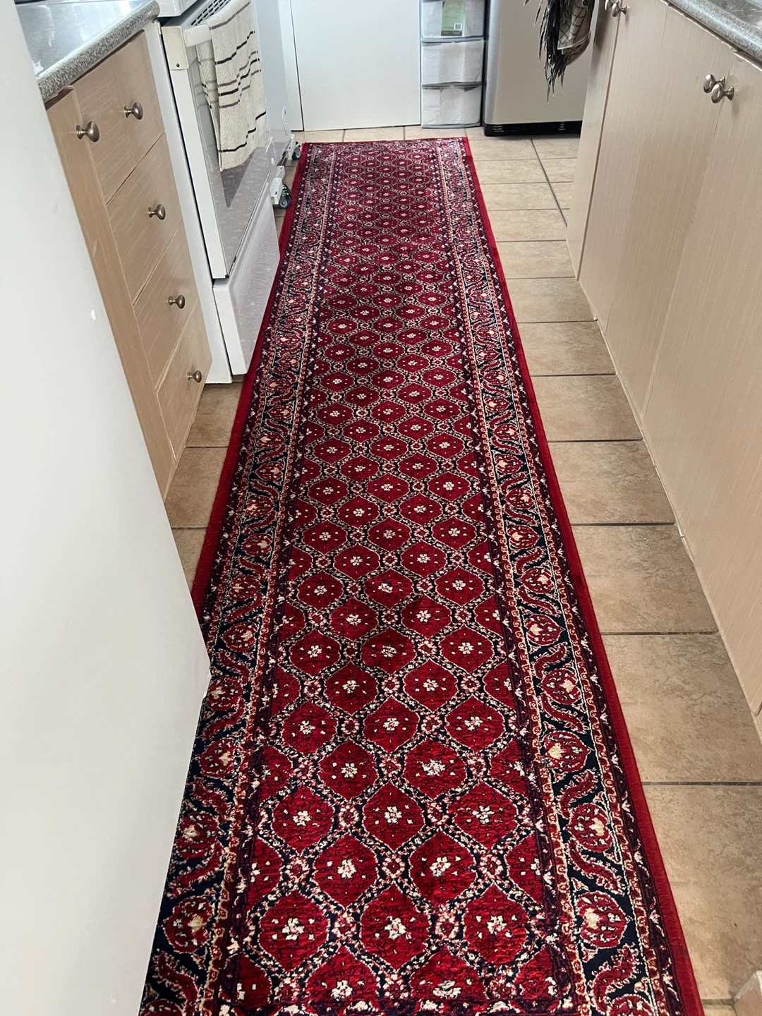 Beautiful red rug with intricate patterns. This runner is perfect for hallways or entryways. It's made of durable material and adds a touch of elegance to any space!