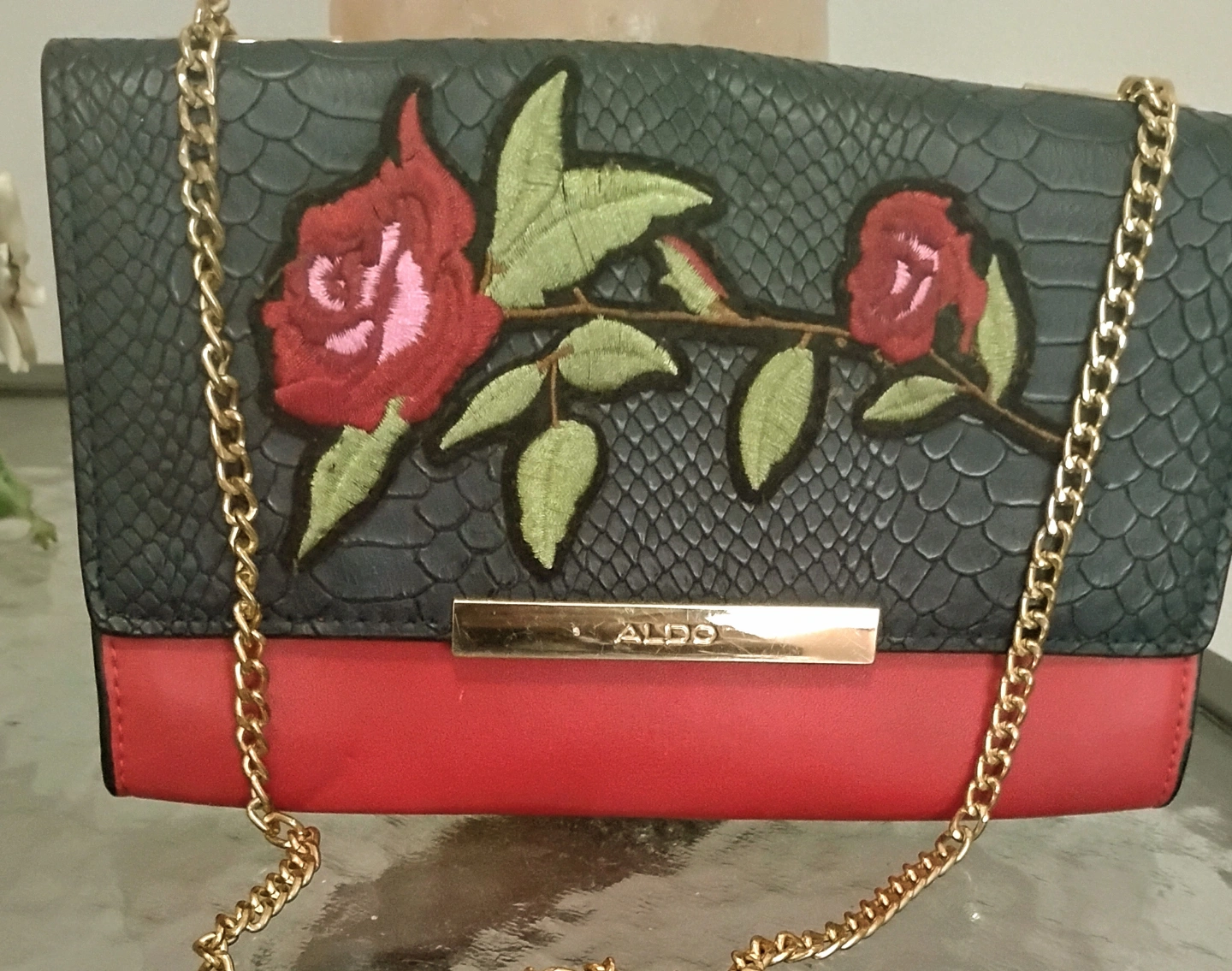 Red and black crossbody bag. Features embroidered roses. Gold chain strap. Snakeskin-textured material. Faux Leather
