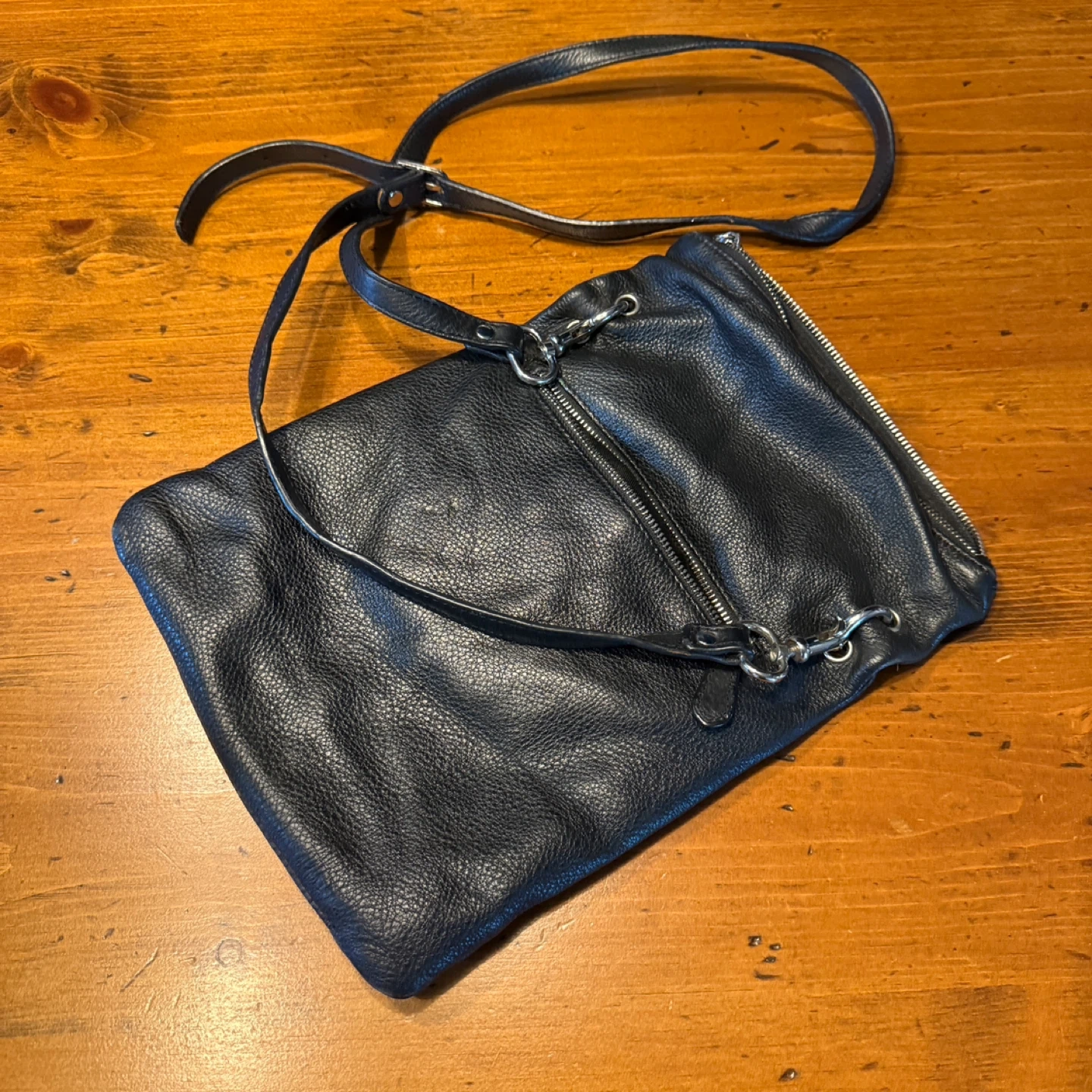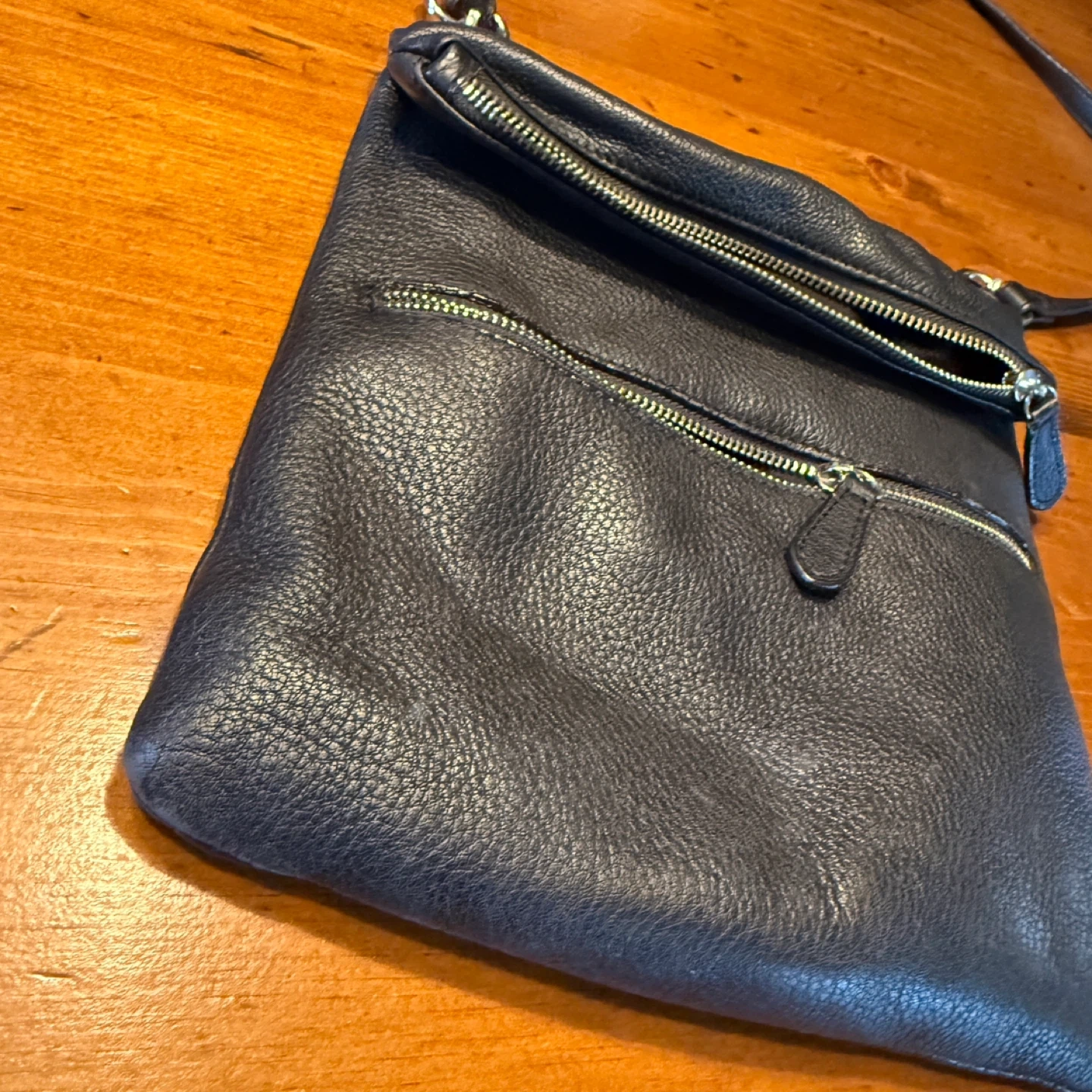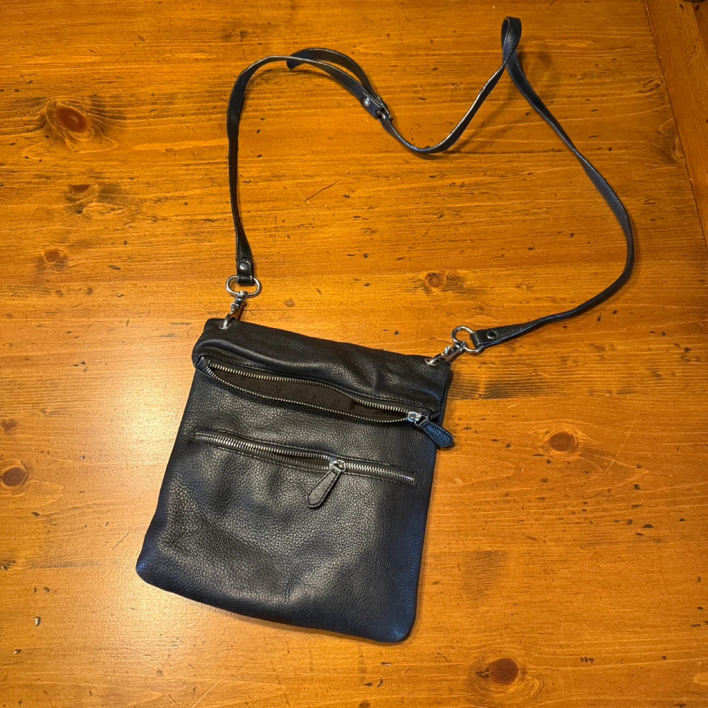 A black pebbled leather crossbody bag. It features multiple zippered compartments for secure storage. The adjustable strap ensures comfortable wear.