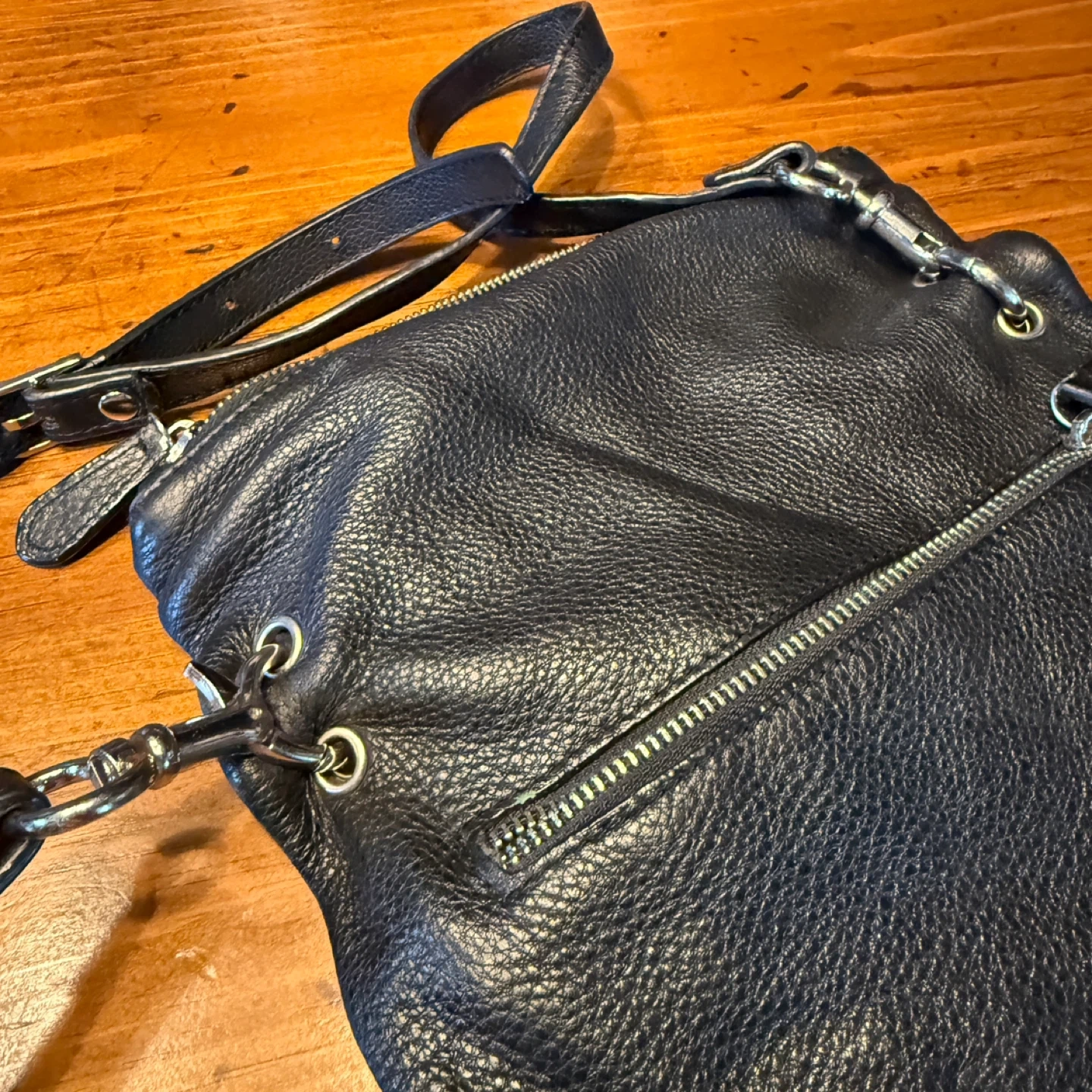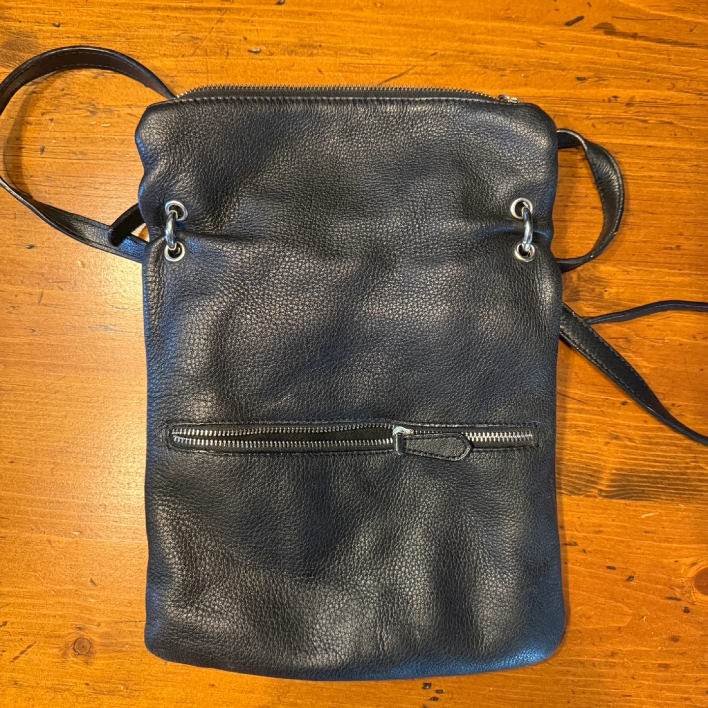 A black pebbled leather crossbody bag. It features multiple zippered compartments for secure storage. The adjustable strap ensures comfortable wear.