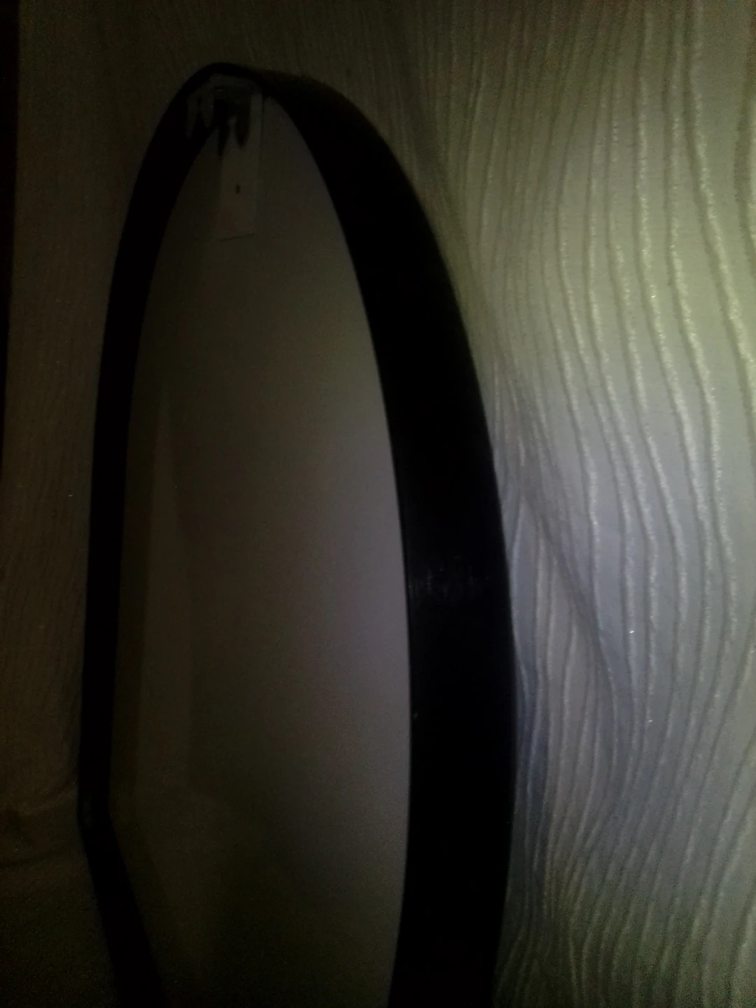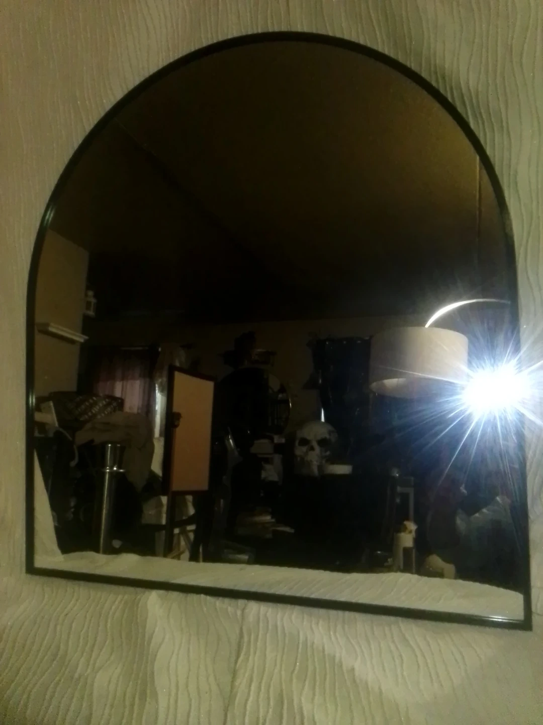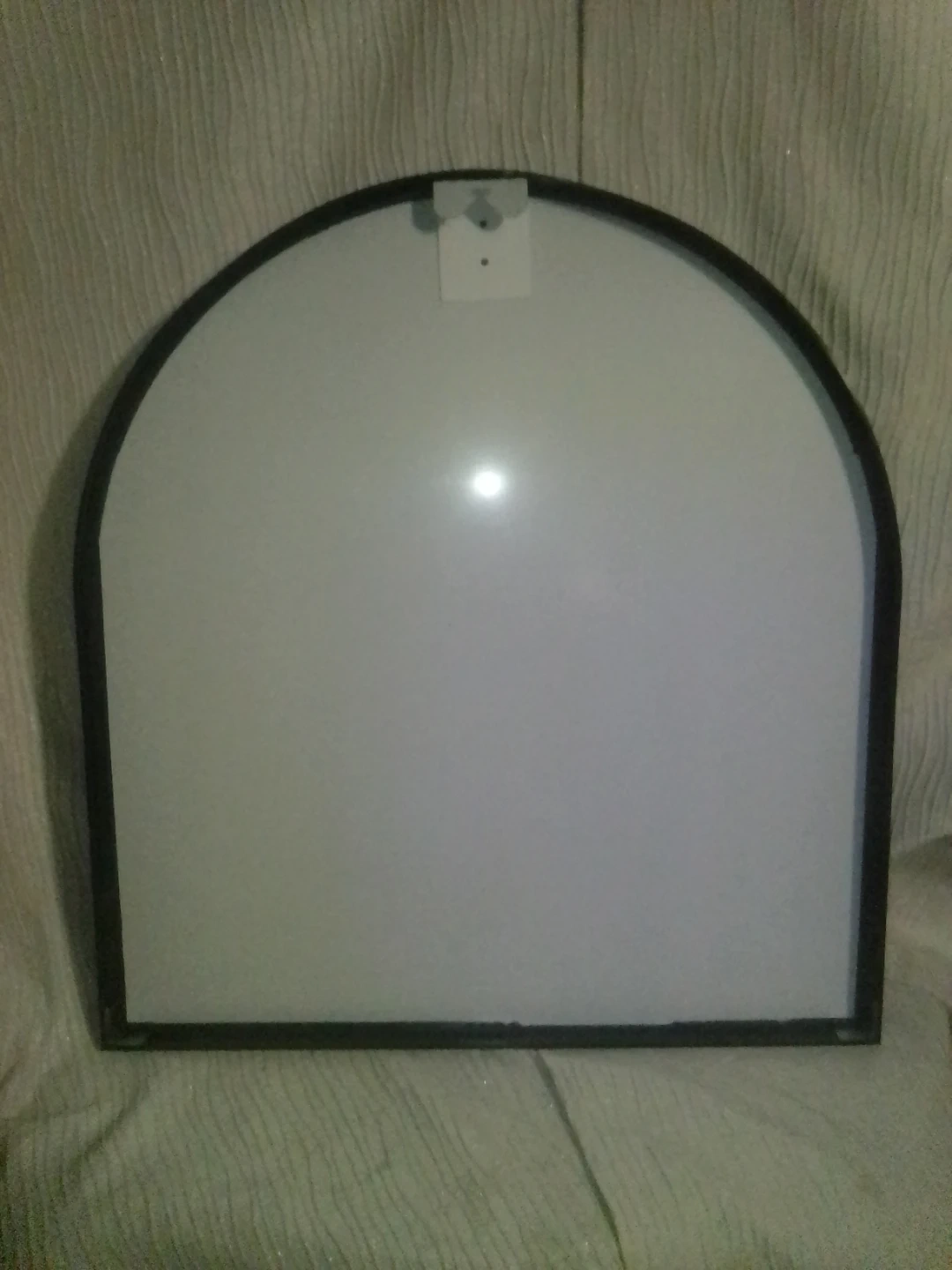 This is an arched mirror with a black frame. It's a simple decorative piece. The mirror is glass and the frame is likely plastic.