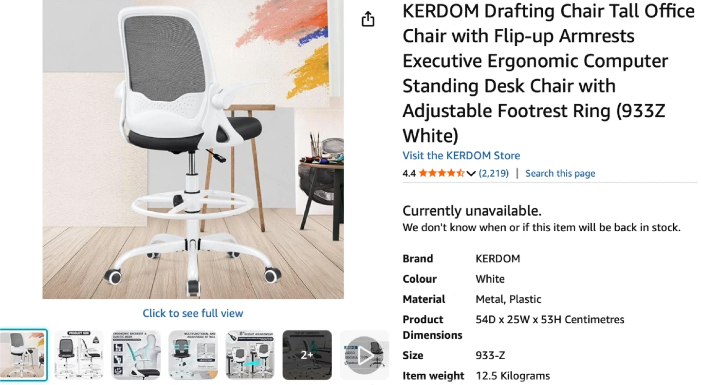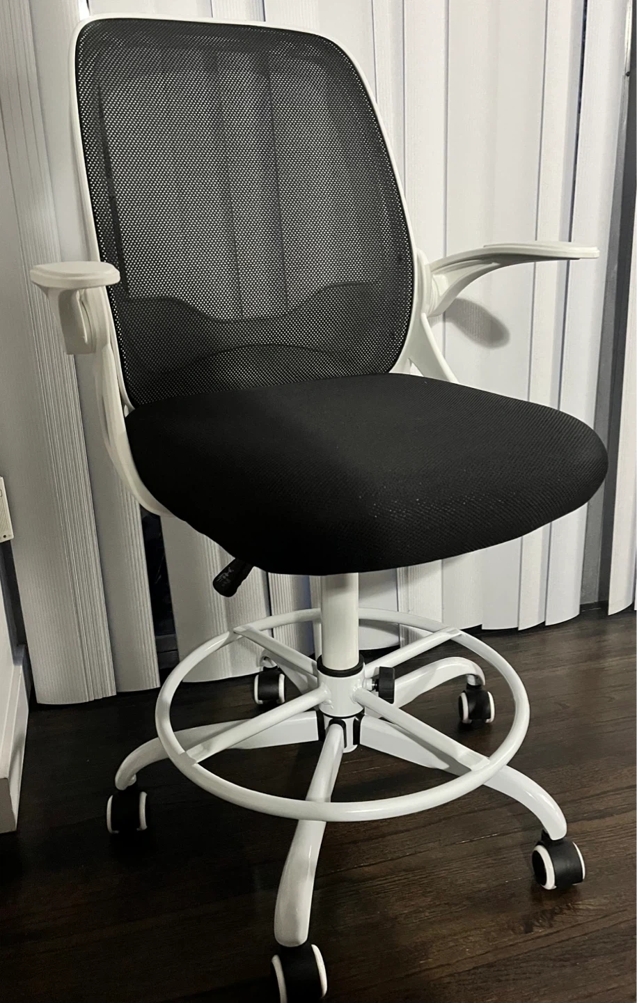 KERDOM drafting chair with flip-up armrests and adjustable footrest ring. This chair is also suitable for standing desks.