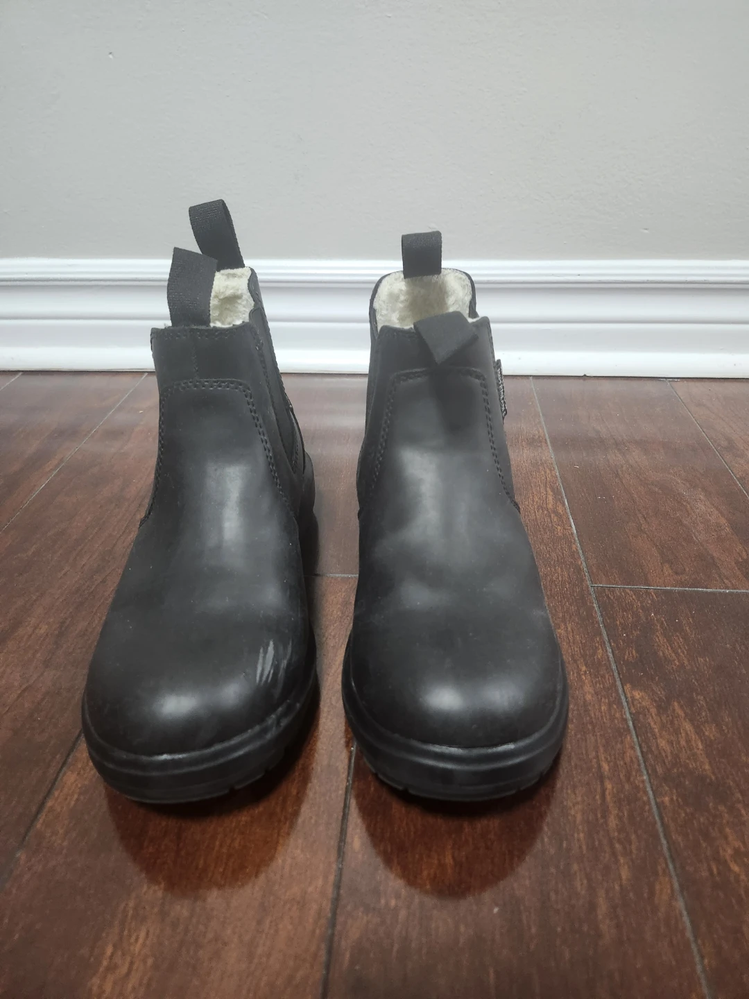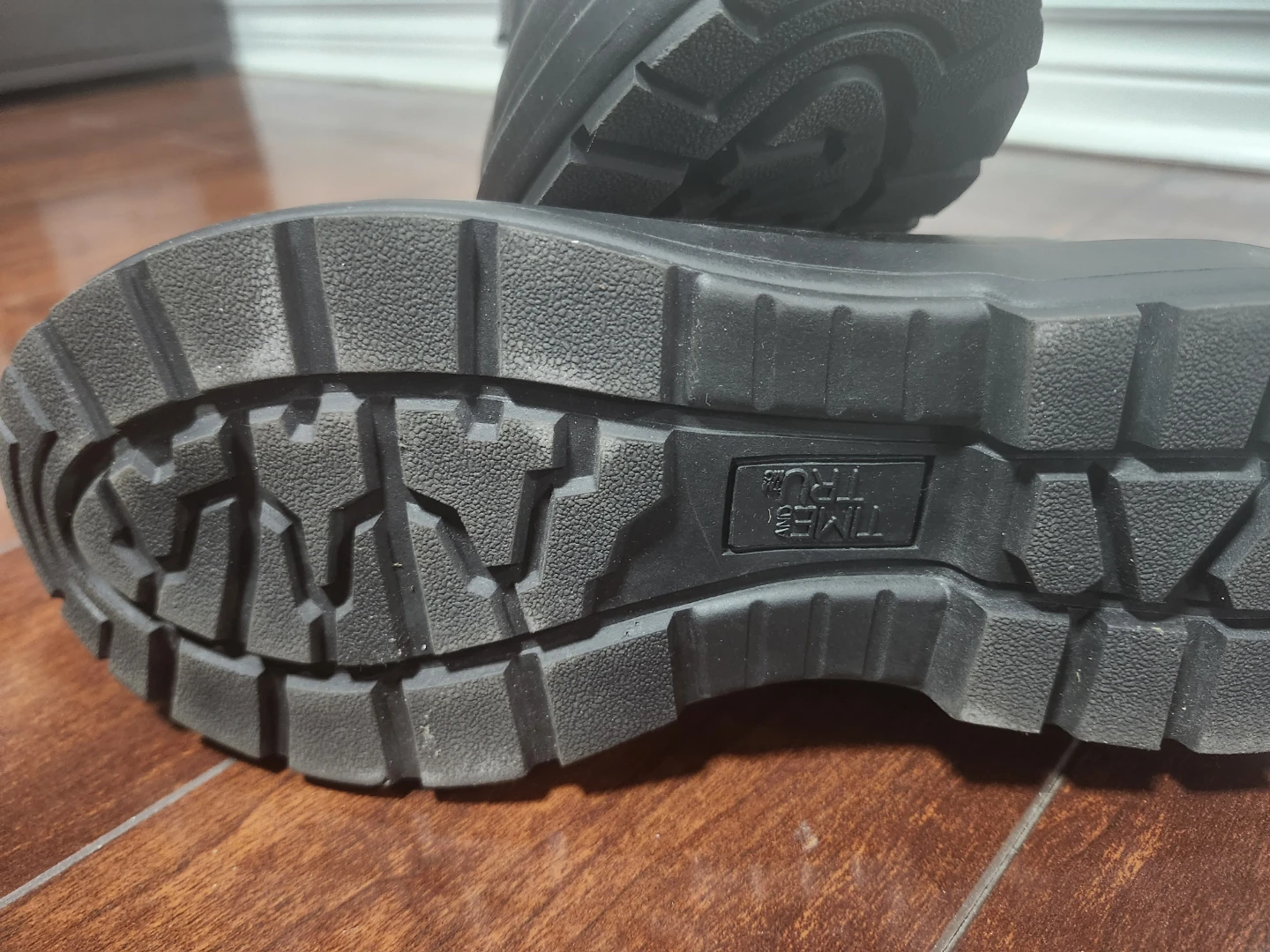 Black waterproof boots featuring 3M Thinsulate insulation. Made in Cambodia. Size 8.