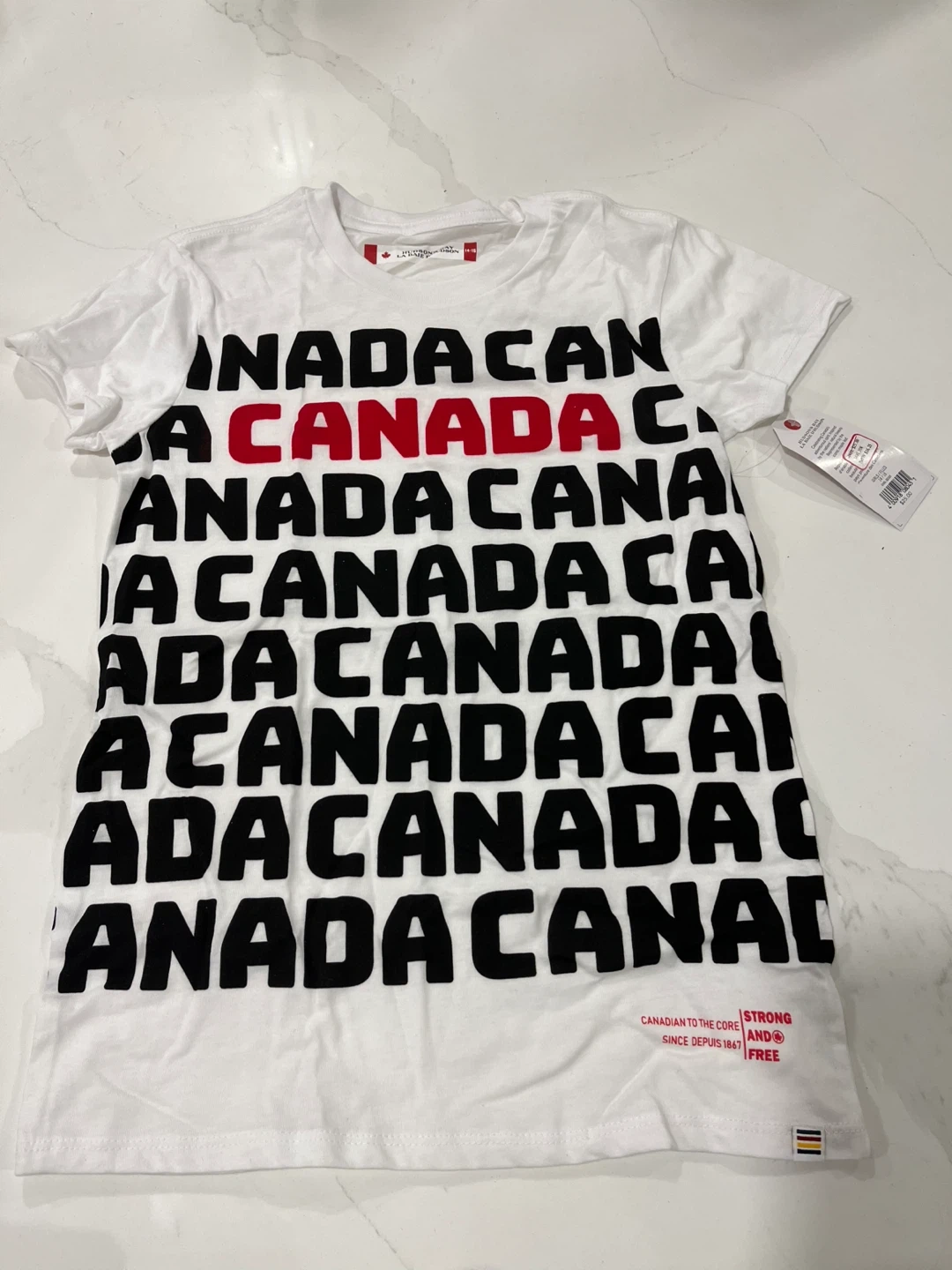 Brand new with tags, these Hudson's Bay t-shirts are perfect for showing off your Canadian pride! The shirts are white with 'CANADA' printed in bold black and red letters. A great addition to any wardrobe!