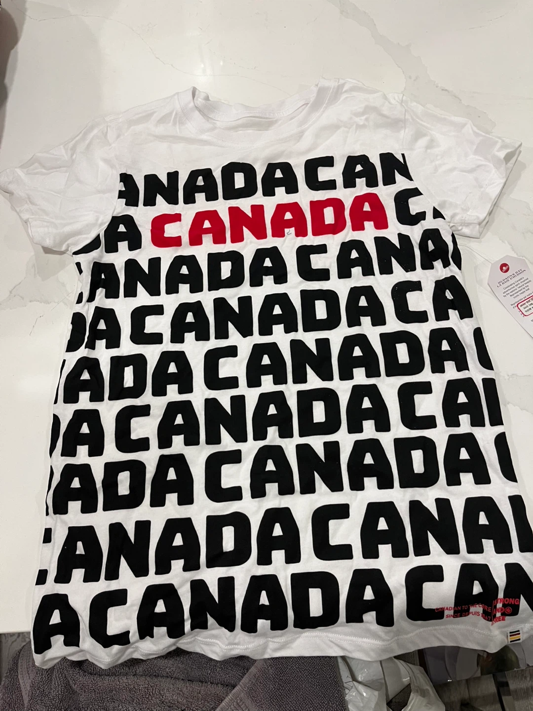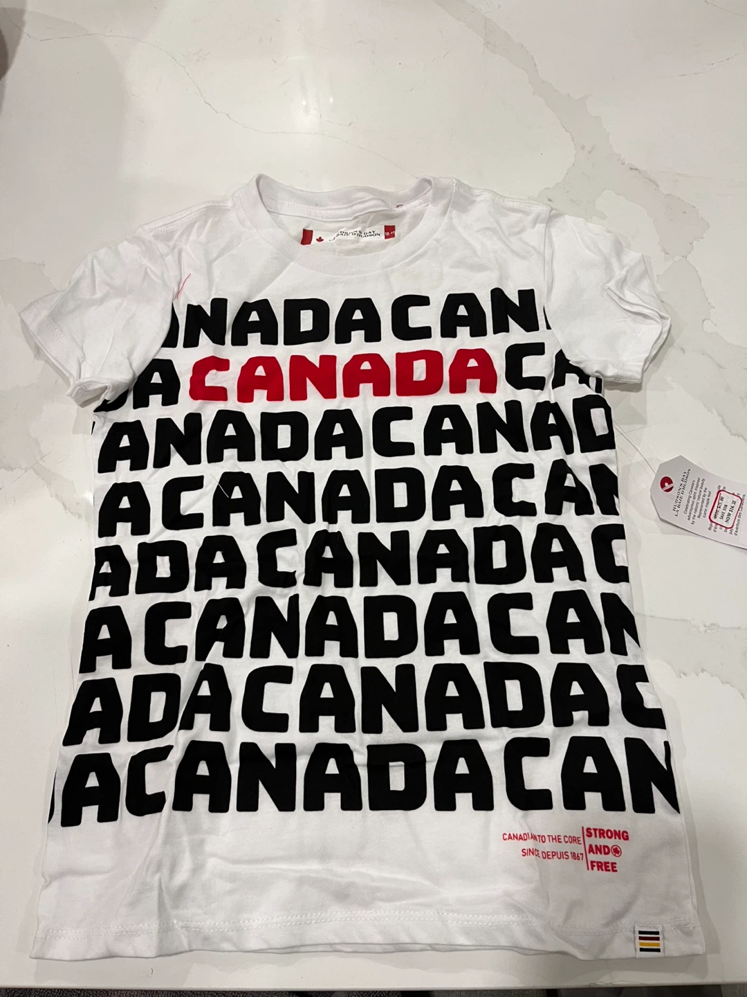 Brand new with tags, these Hudson's Bay t-shirts are perfect for showing off your Canadian pride! The shirts are white with 'CANADA' printed in bold black and red letters. A great addition to any wardrobe!