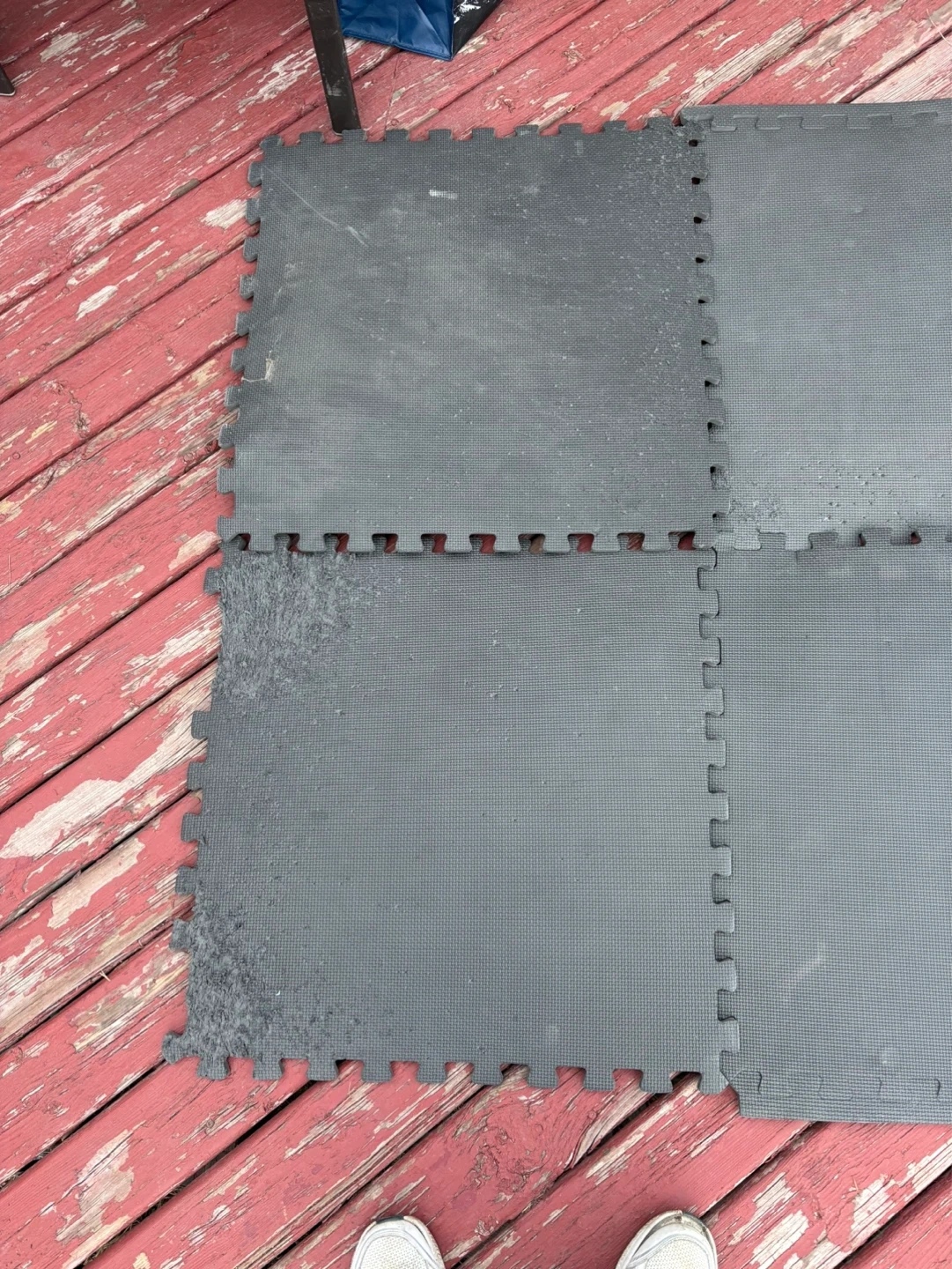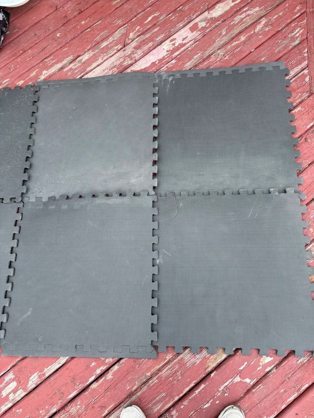 This is a set of six grey interlocking foam floor mats. They're made of EVA foam for cushioning. Some wear and tear visible on the edges, with some debris on the surface. Perfect for home gyms or play areas!