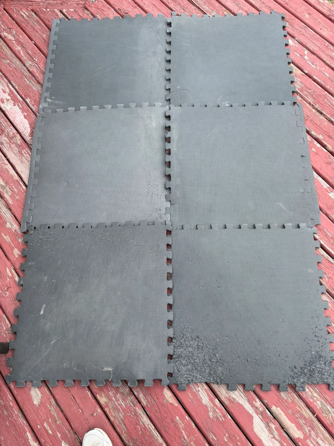 This is a set of six grey interlocking foam floor mats. They're made of EVA foam for cushioning. Some wear and tear visible on the edges, with some debris on the surface. Perfect for home gyms or play areas!