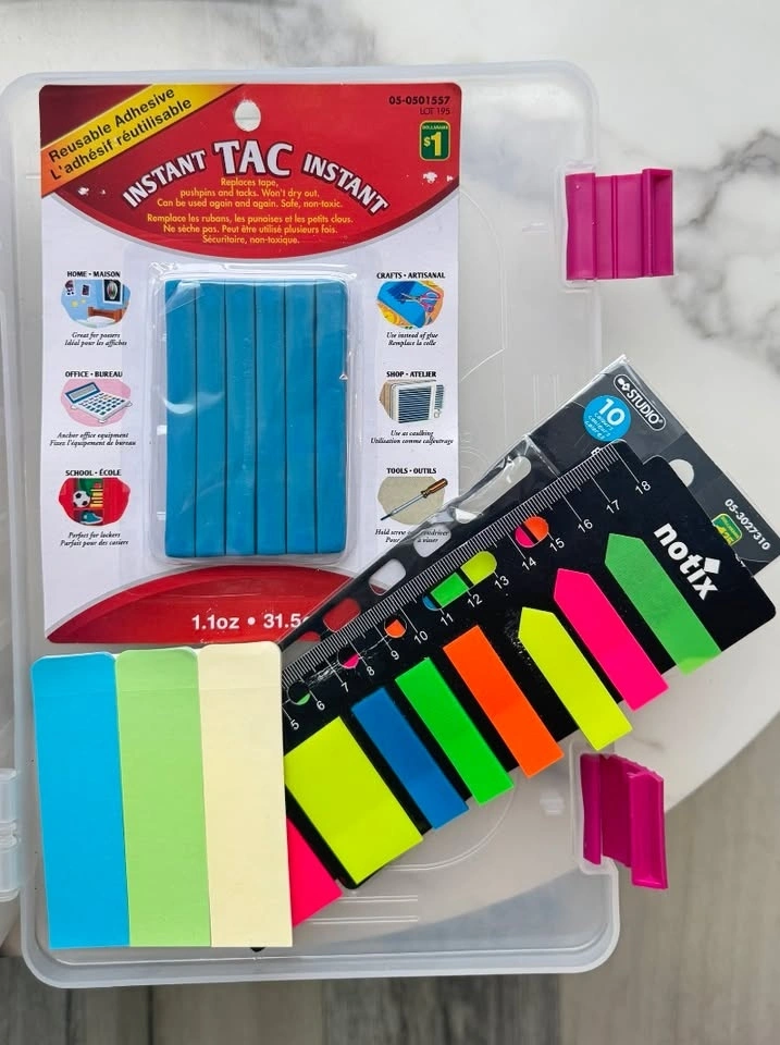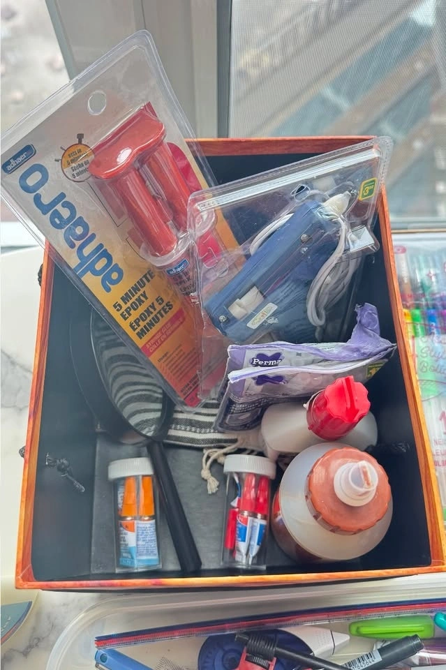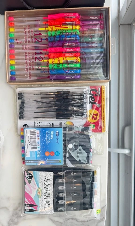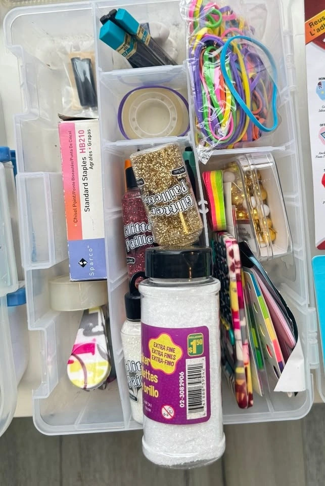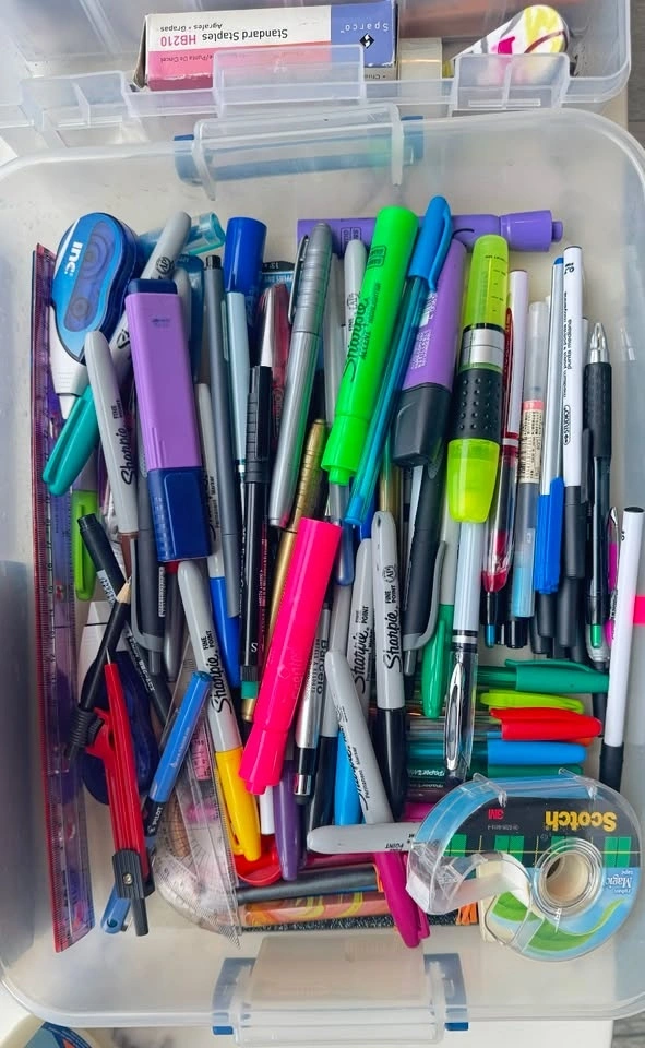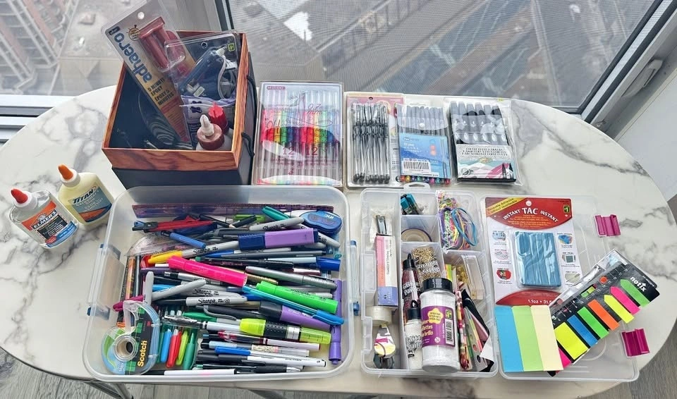 Large arts & crafts / stationery bundle with a wide variety of supplies for school, DIY projects, scrapbooking, and creative work. Includes markers, pens, craft materials, adhesives, and storage organizers. Bundle includes: Multiple marker and pen sets (gel pens, metallic markers, drawing markers), Large assortment of pens, Sharpies, and highlighters, Craft supplies (glitter, decorative tape, rubber bands, embellishments), Glue and adhesives (Elmer’s glue, craft glue, epoxy), Sticky notes and page markers, Assorted stationery tools (ruler, tape, stapler supplies, etc.), Storage organizer boxes. Perfect for students, teachers, artists, DIY projects, journaling, scrapbooking, or craft lovers. Everything sold together as one bundle.