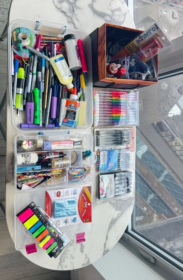 Large arts & crafts / stationery bundle with a wide variety of supplies for school, DIY projects, scrapbooking, and creative work. Includes markers, pens, craft materials, adhesives, and storage organizers. Bundle includes: Multiple marker and pen sets (gel pens, metallic markers, drawing markers), Large assortment of pens, Sharpies, and highlighters, Craft supplies (glitter, decorative tape, rubber bands, embellishments), Glue and adhesives (Elmer’s glue, craft glue, epoxy), Sticky notes and page markers, Assorted stationery tools (ruler, tape, stapler supplies, etc.), Storage organizer boxes. Perfect for students, teachers, artists, DIY projects, journaling, scrapbooking, or craft lovers. Everything sold together as one bundle.