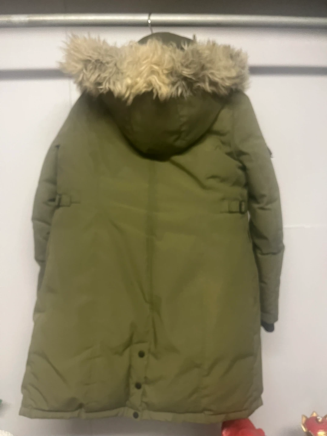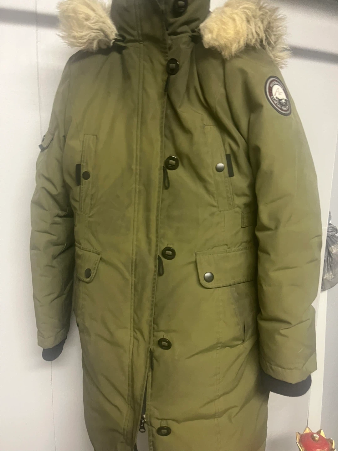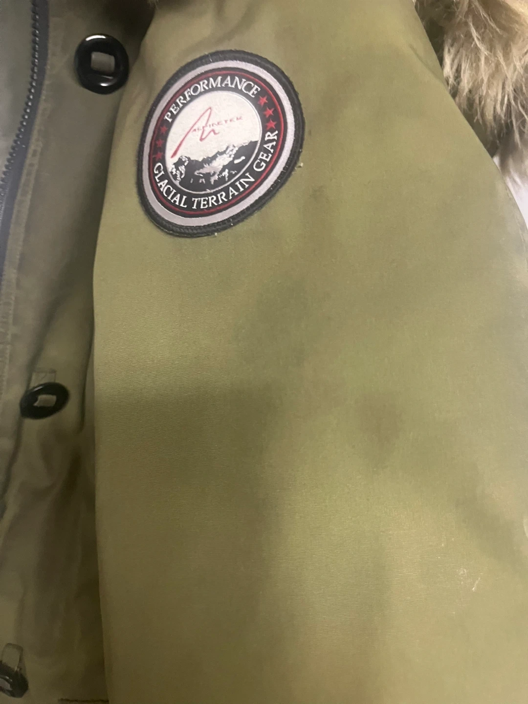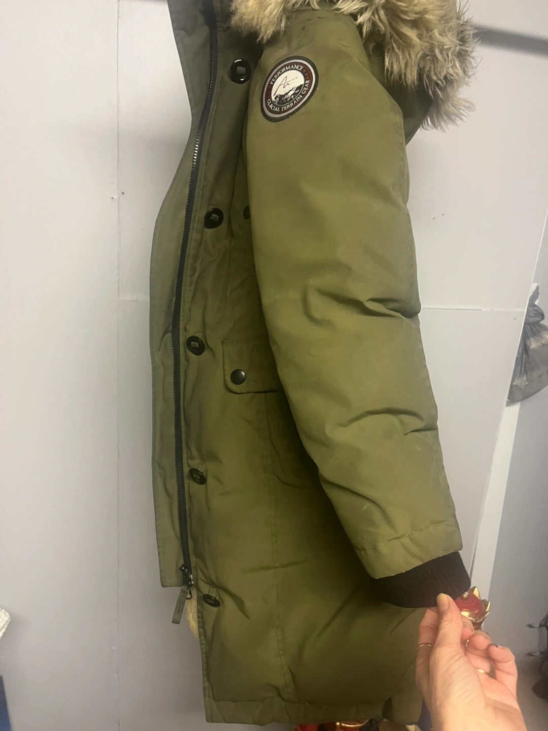 Warm green parka jacket from Glacial Terrain Gear. Features a fur-lined hood and multiple pockets. Great for keeping cozy in the cold!