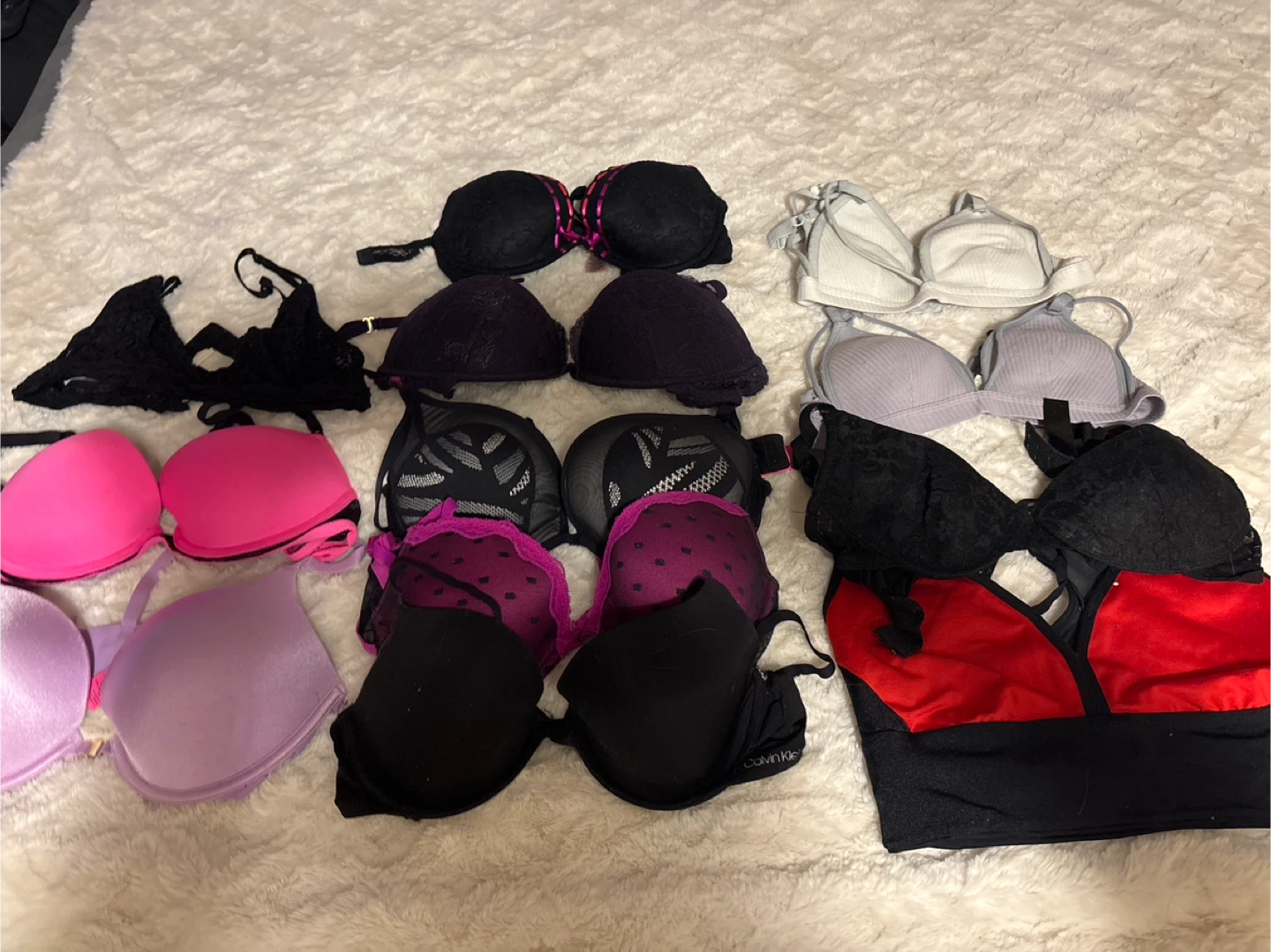 A collection of assorted bras. Includes lace, push-up, and bralette styles in various colours. Some bras are Calvin Klein. Material is a mix of fabric and lace.