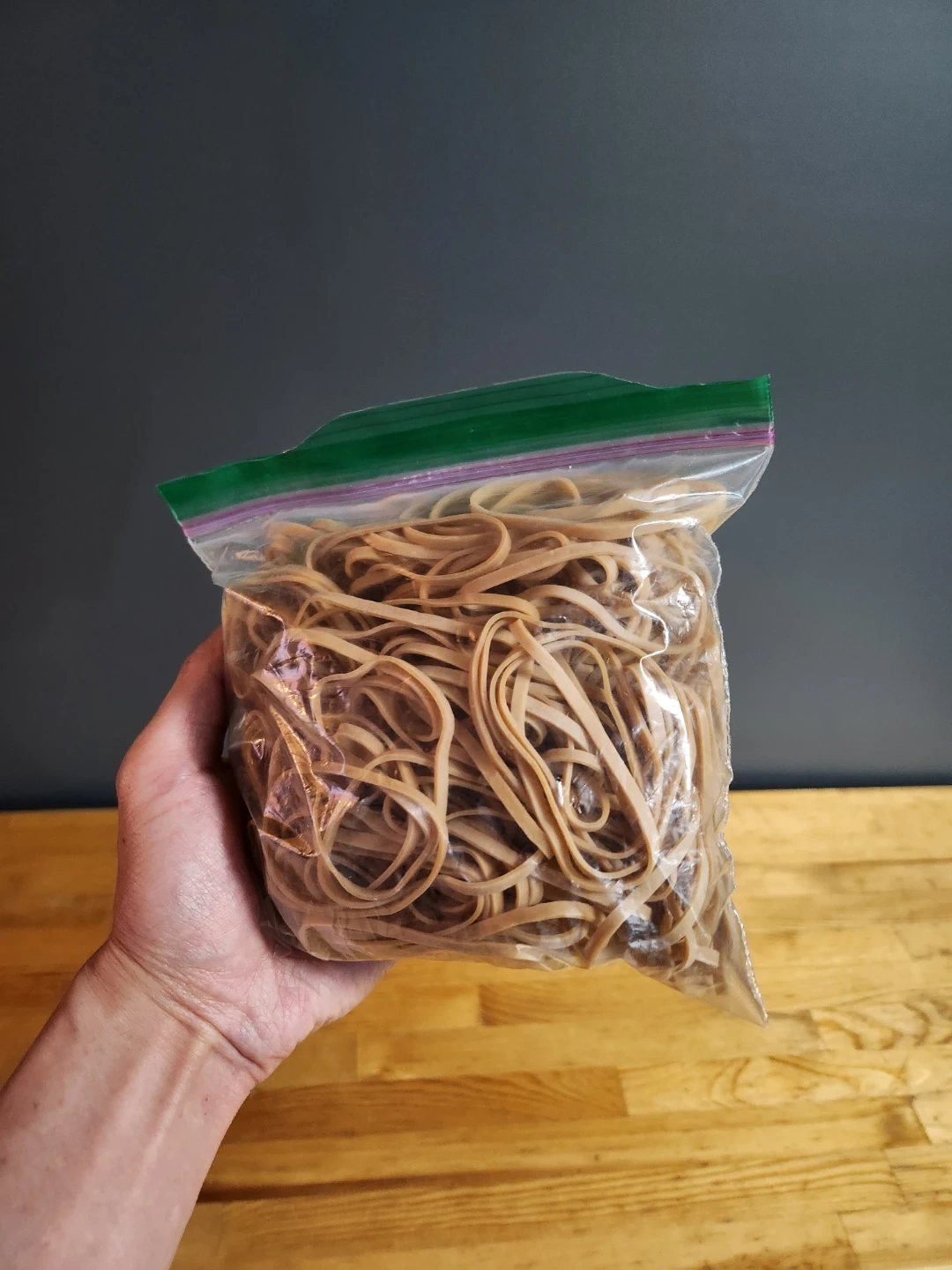 Bag of rubber bands. These are standard size and made of rubber. They come in a reusable zip-top bag.
