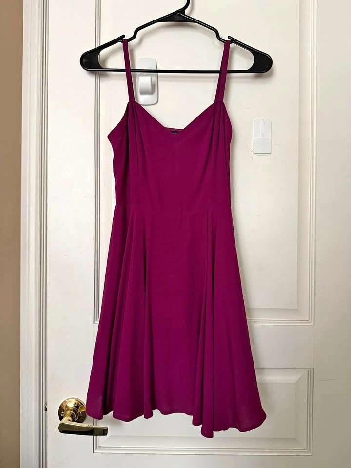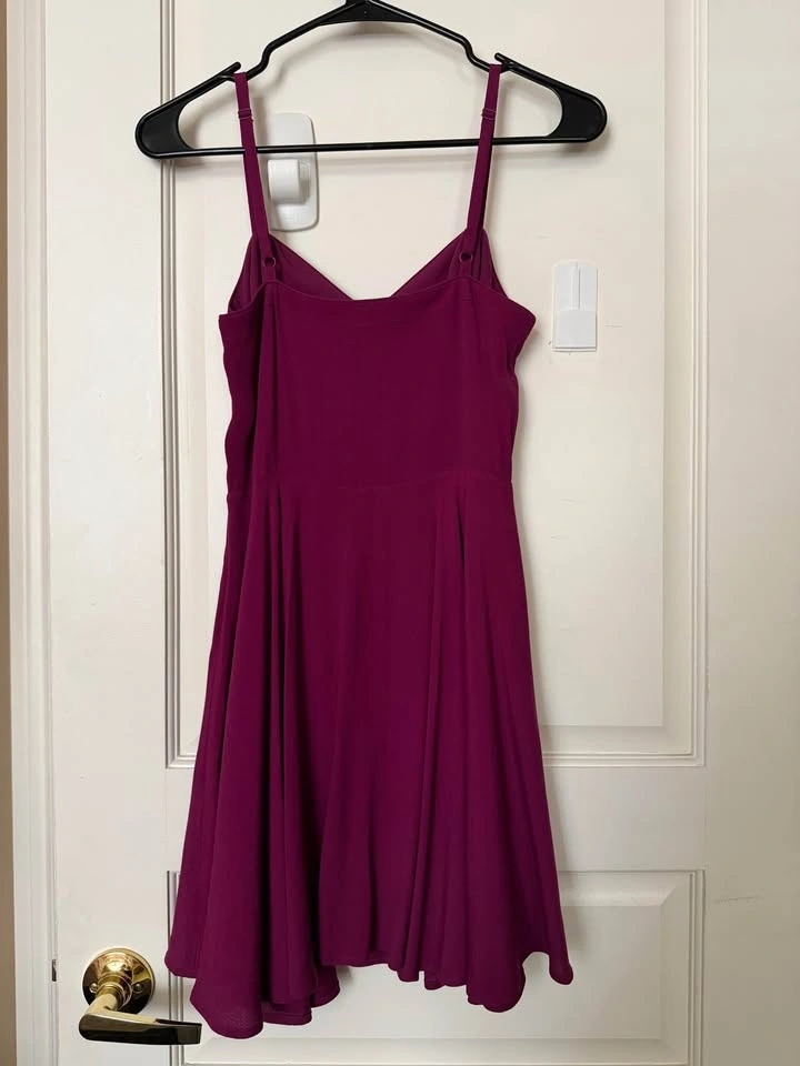 - The dress is a deep berry / wine-toned purple. More specifically, it sits between: Burgundy, Plum, Dark magenta