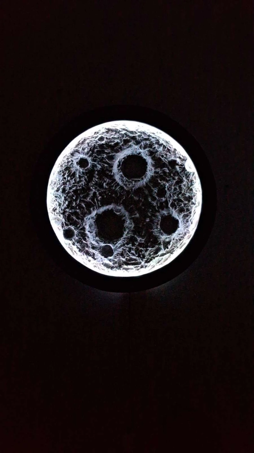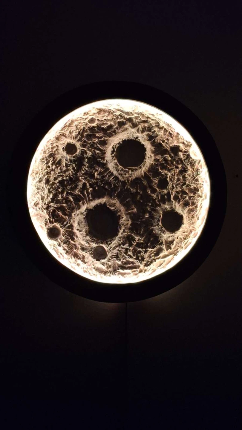 Stunning handmade moon wall light with color-changing LED effects that create a magical, space-like atmosphere in any room. The detailed 3D crater texture makes it look like a real moon, while the LED colors give it a modern aesthetic vibe.