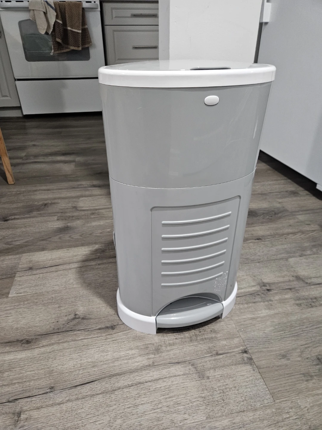 Selling a Dékor hands-free diaper pail in grey! It's in great shape and ready to keep those odours at bay. This pail is super convenient and easy to use, making diaper changes a breeze!