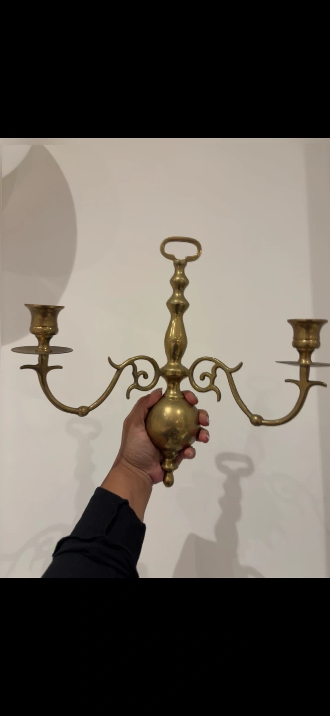 Vintage brass taper candle holder with a unique design. This holder has two arms, each with a cup for a taper candle. It's made of solid brass and has a nice patina from age. It's perfect for adding a classic touch to your decor.