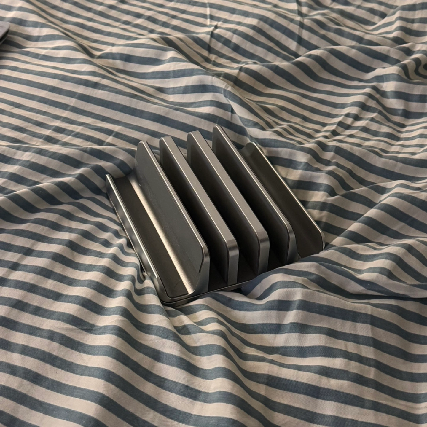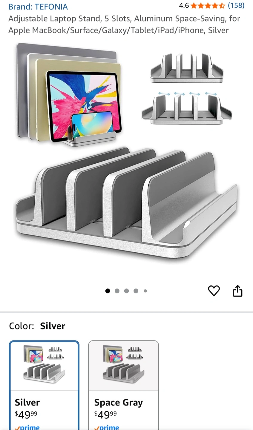 Selling a TEFONIA adjustable laptop stand in silver! It has 5 slots and is made of aluminum, perfect for saving space on your desk. It's designed for Apple MacBook, Surface, Galaxy, Tablets, iPad, and iPhones. Get organized with this handy stand!