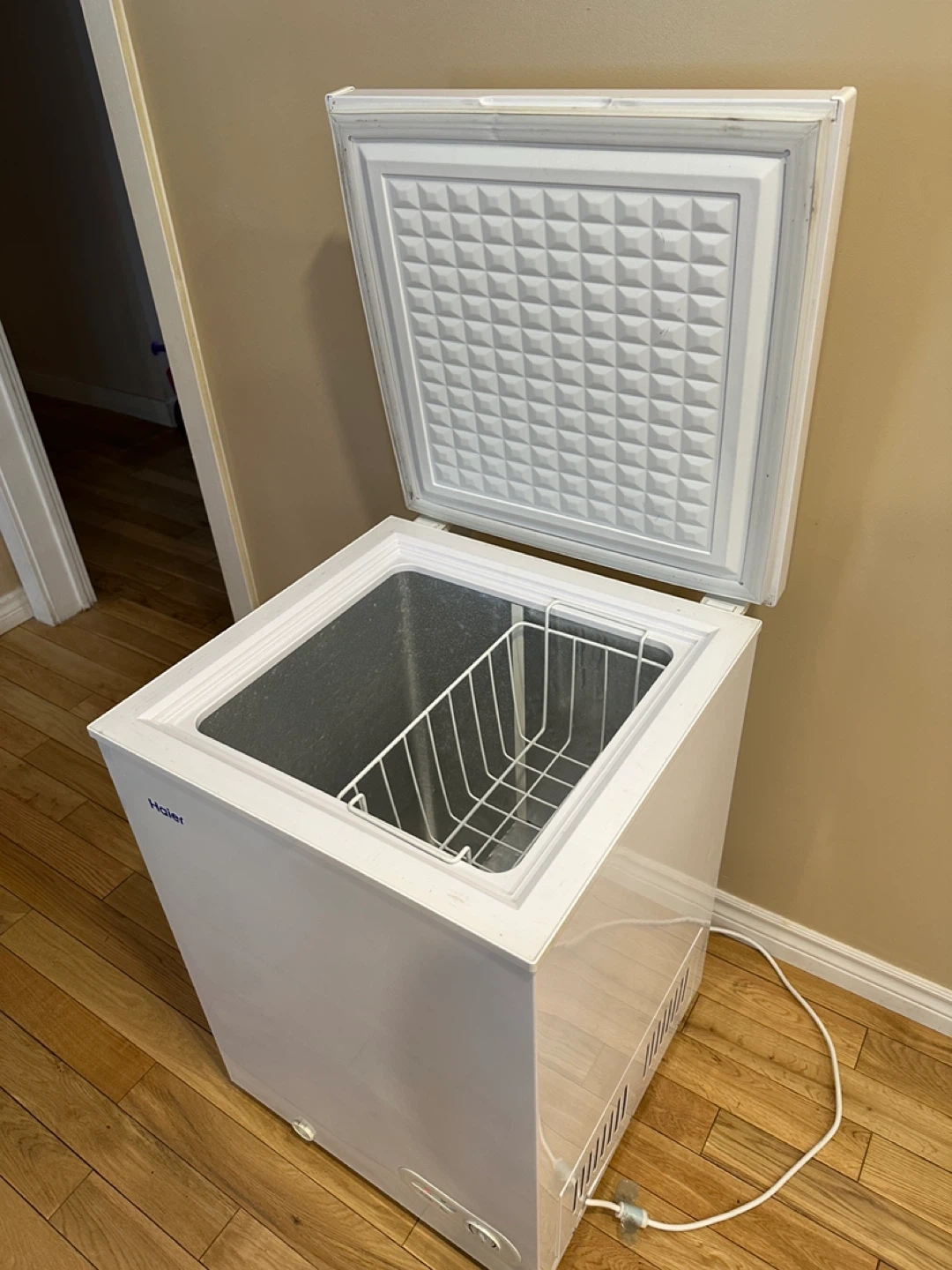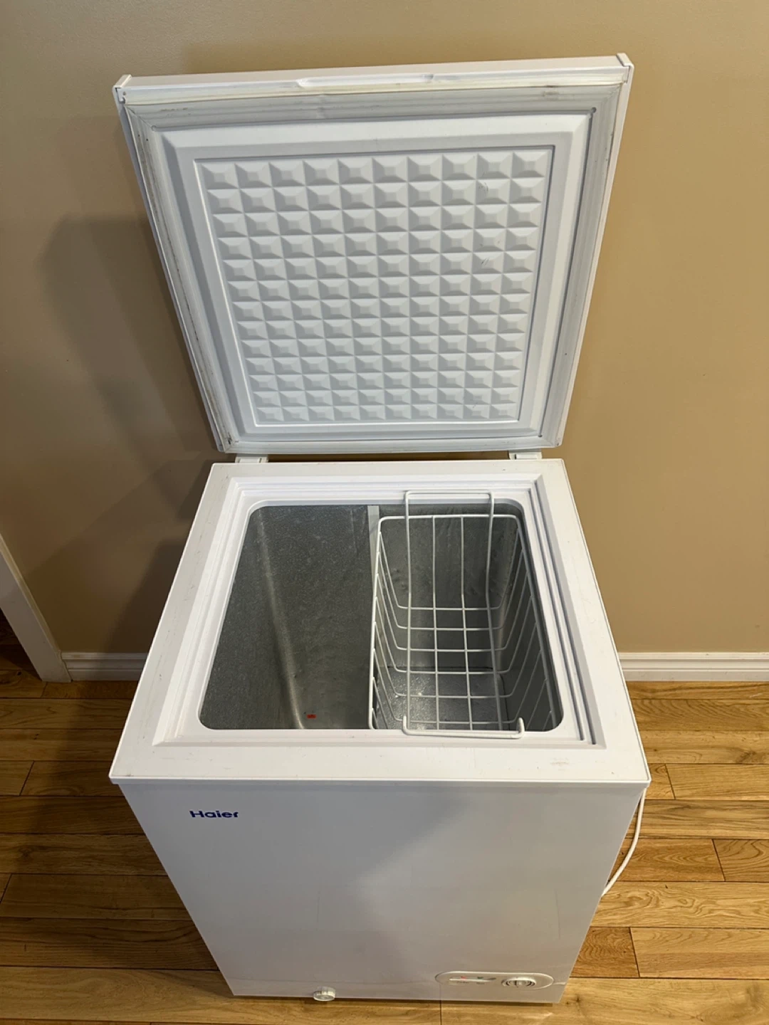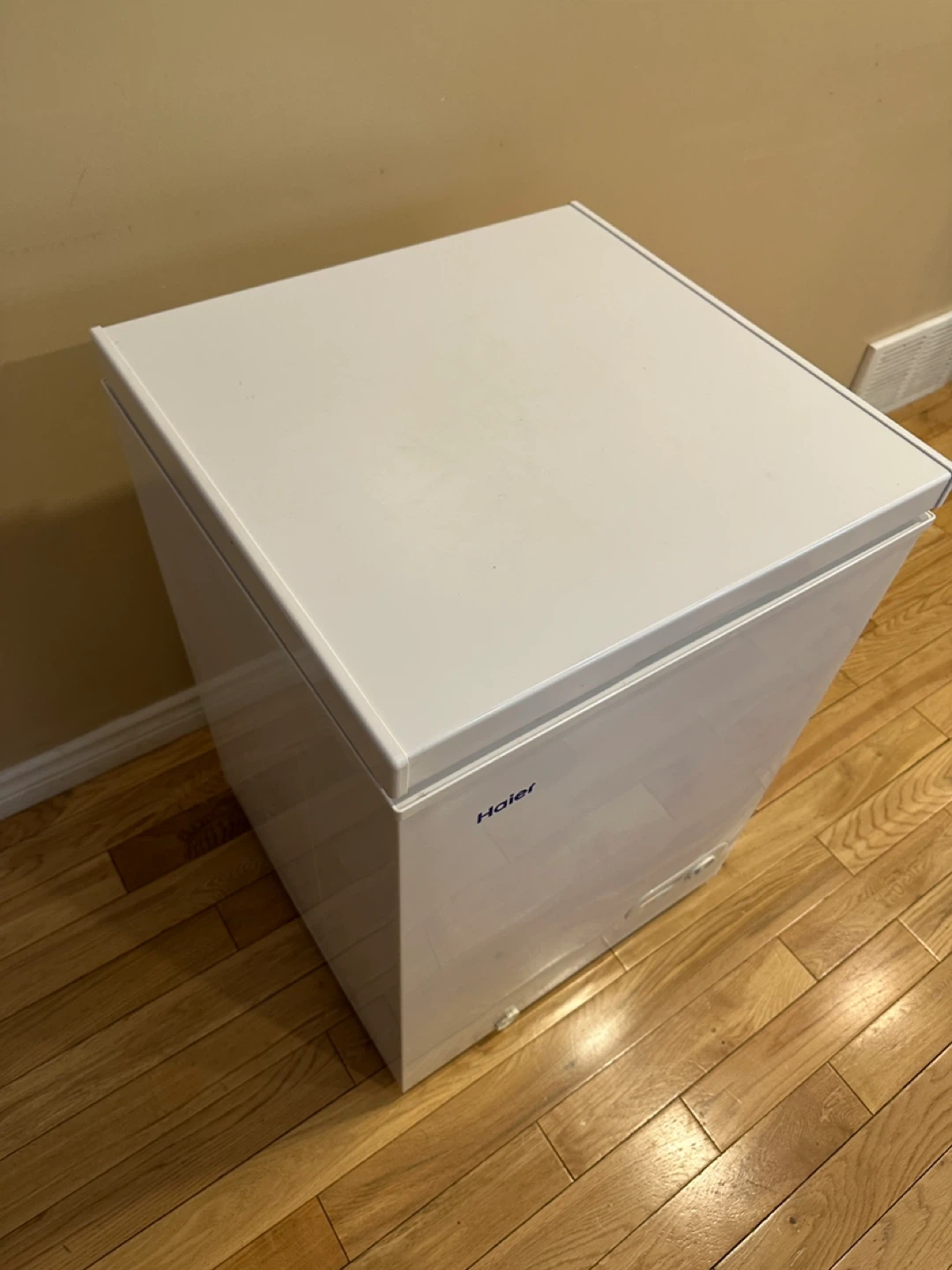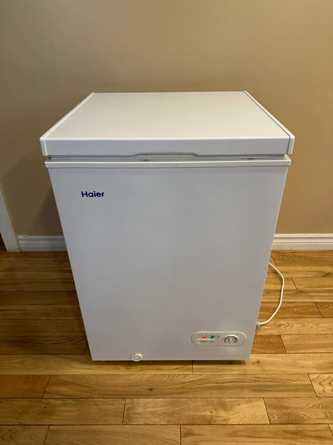 Clean and fully working Haier chest freezer in very good condition. Perfect size for an apartment, condo, basement, or extra freezer storage.