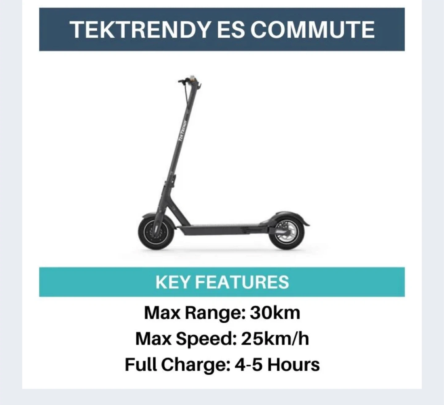 TEKTRENDY electric scooter offers a max range of 30km and a max speed of 25km/h.