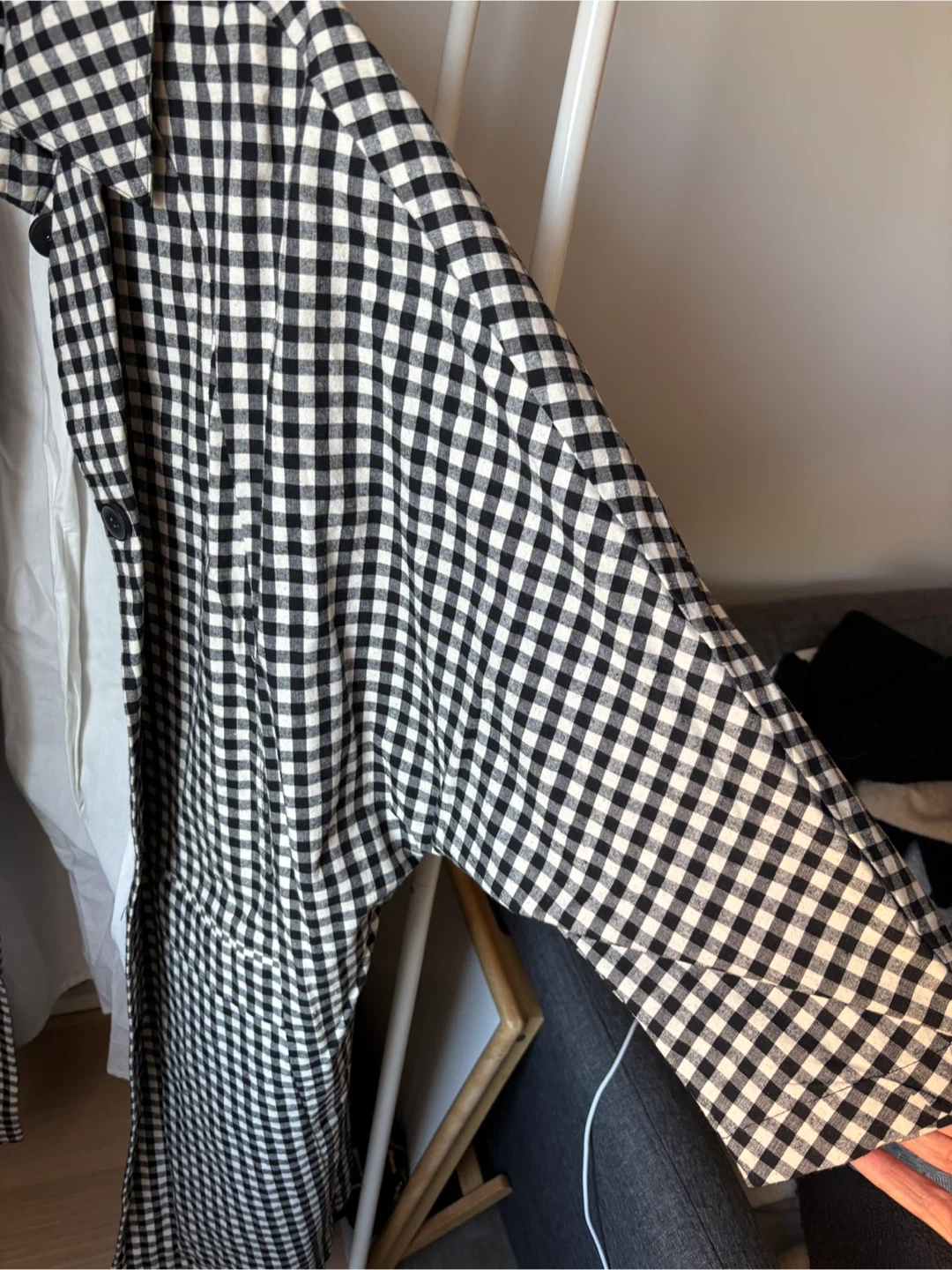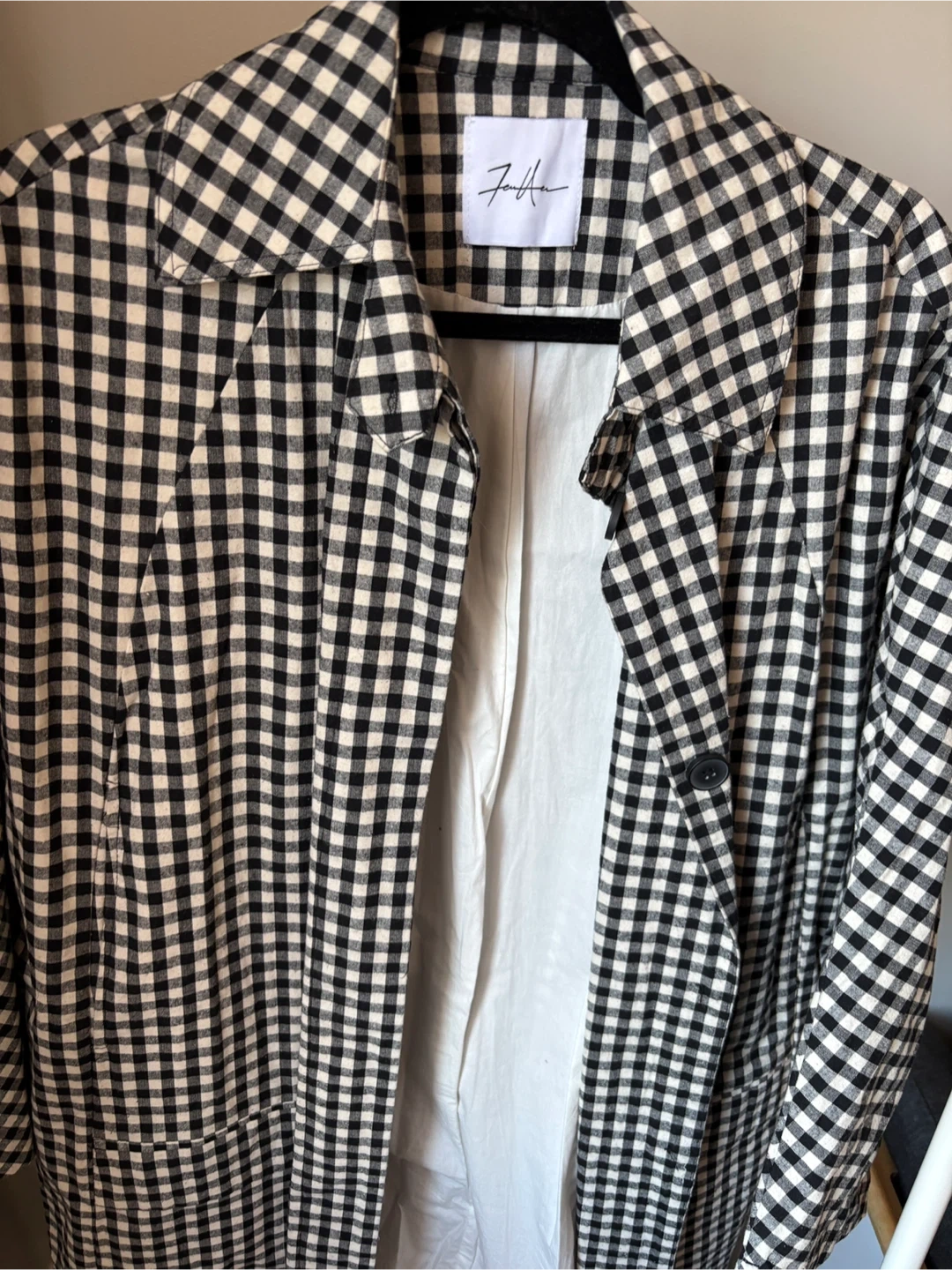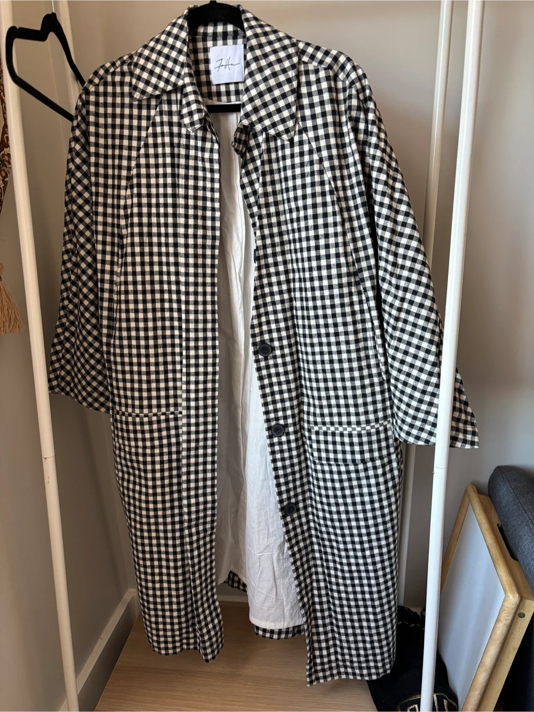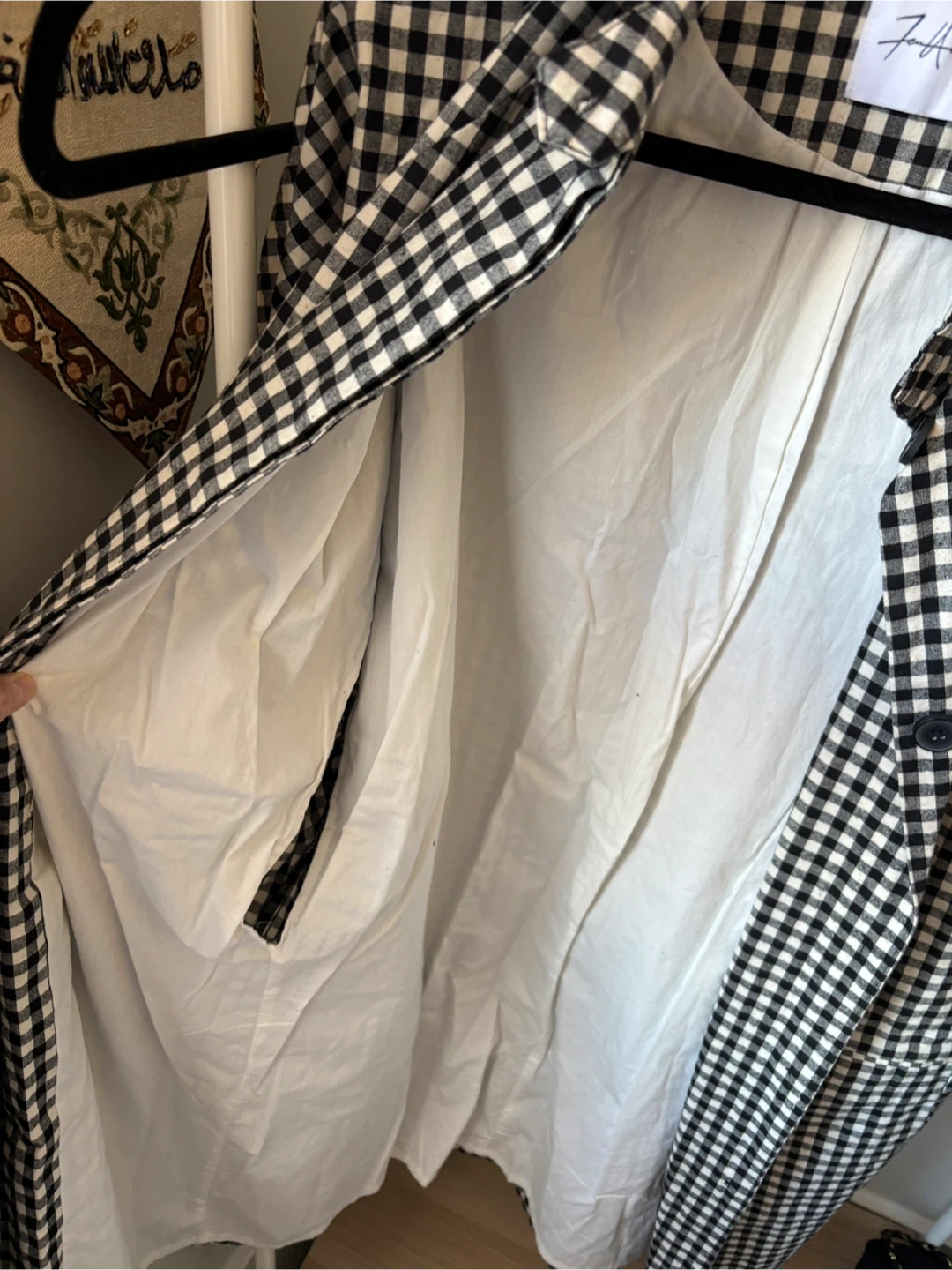 Chic Jaffa trench coat with a classic black and white gingham pattern. Features a white lining and button closure. 100% cotton material.