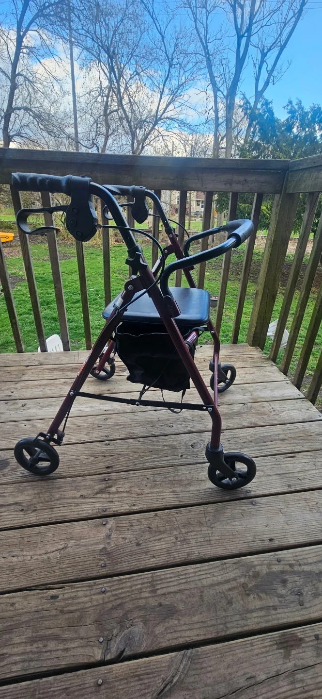 This rollator walker is designed to assist with mobility. It features a built-in seat for resting and a storage bag for convenience. The frame is a deep red color and it's equipped with wheels for easy movement.