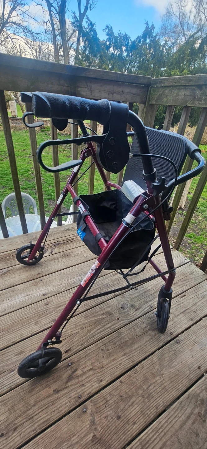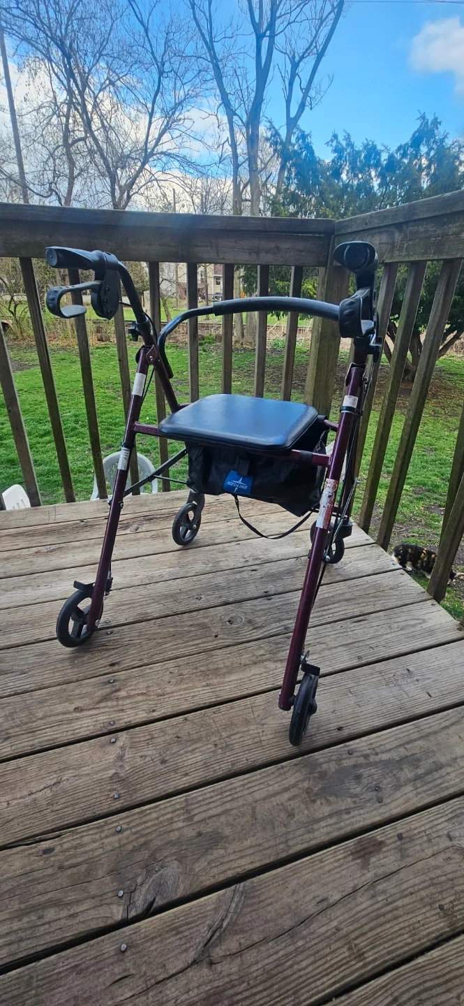 This rollator walker is designed to assist with mobility. It features a built-in seat for resting and a storage bag for convenience. The frame is a deep red color and it's equipped with wheels for easy movement.