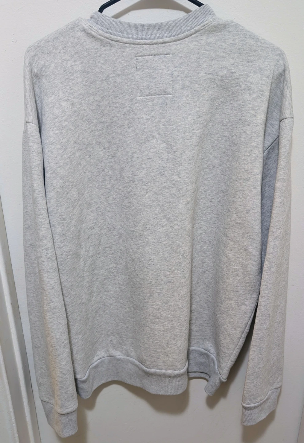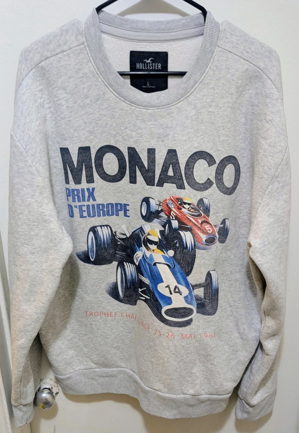 This Hollister crewneck sweatshirt features a large graphic print of vintage race cars and "Monaco Prix D'Europe" text. It's made of a soft, heather grey material. The size tag indicates Large. Good condition.