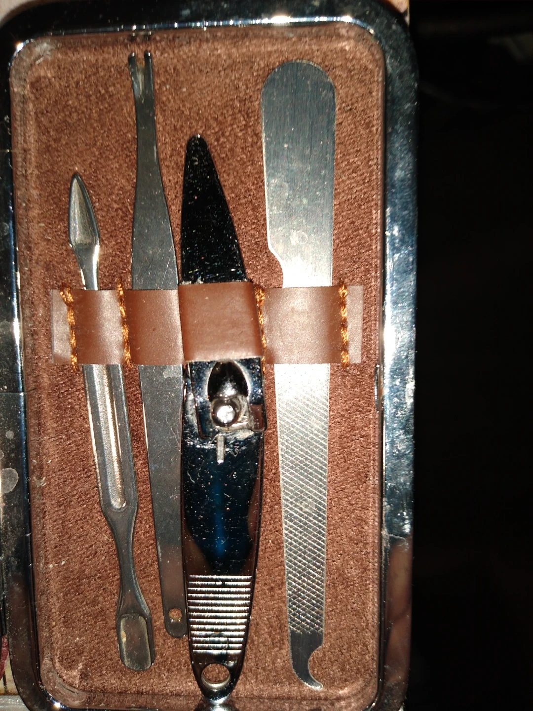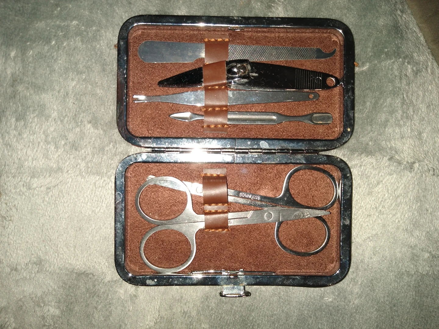 This is a very handy personal manicure kit it has two pairs of stainless steel surgical steel nail clippers two pairs of scissors one with the curled up tip several other tools for doing your cuticles and nails and for anyone who likes to travel or just likes to keep their pedicure I mean manicure up to date or pedicure and I make a great Christmas present for anyone on your list