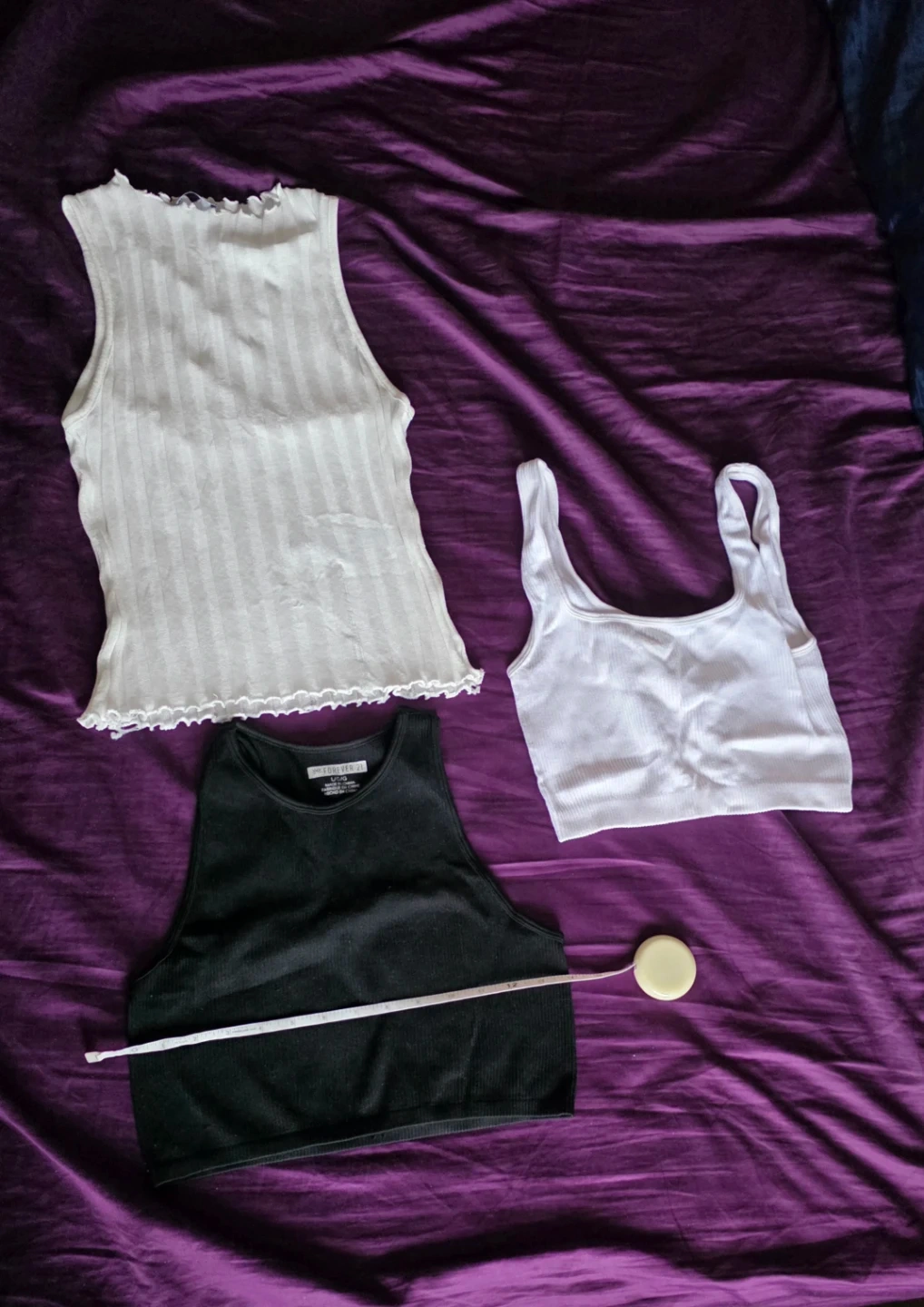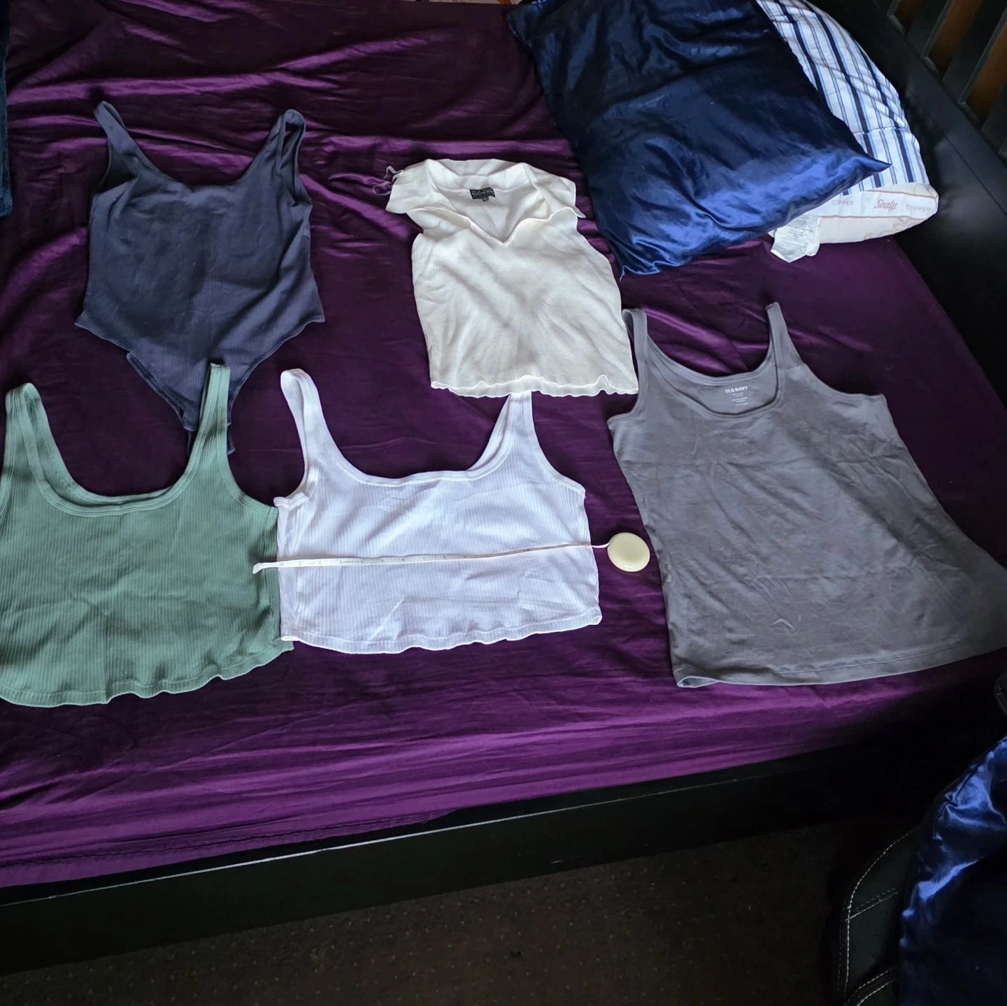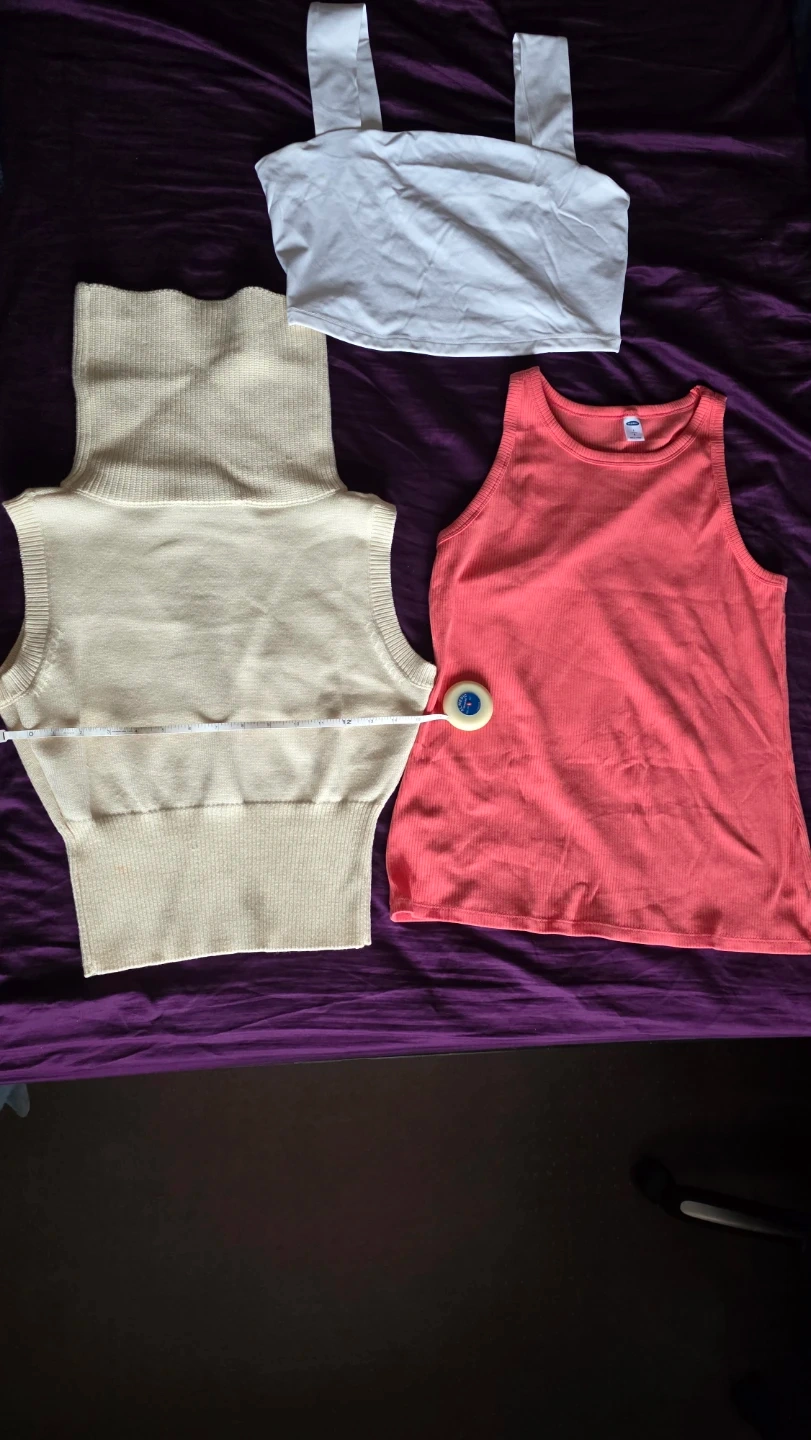 11 women's tank tops in various colours and styles. Materials are primarily ribbed knit fabrics. Width 14 - 15 inches, Size Large.