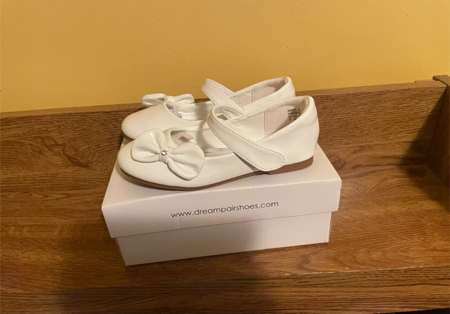 Dream Pairs Angel-5 white patent Mary Jane shoes for kids. Size US 9, EUR 26, JPN 15.5cm. Made in China. These Mary Janes have a sweet bow and gem detail.