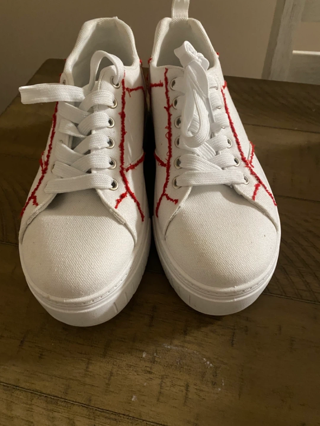These are white canvas sneakers with a hand made unique red stitching detail. They feature a lace-up closure and a durable white sole. The material is canvas.