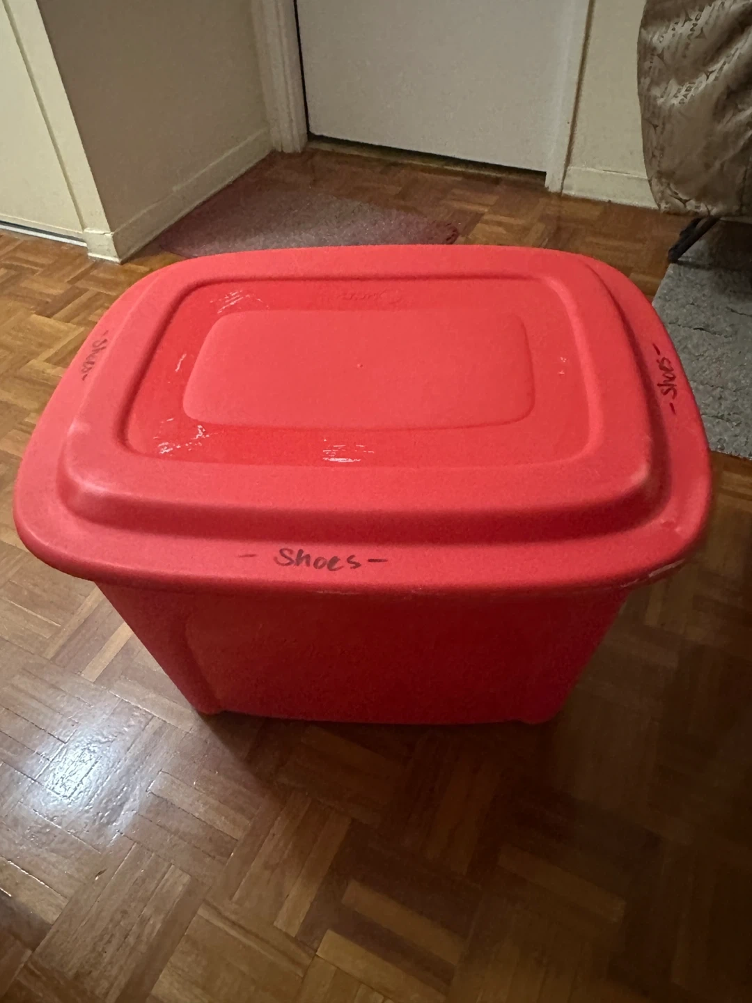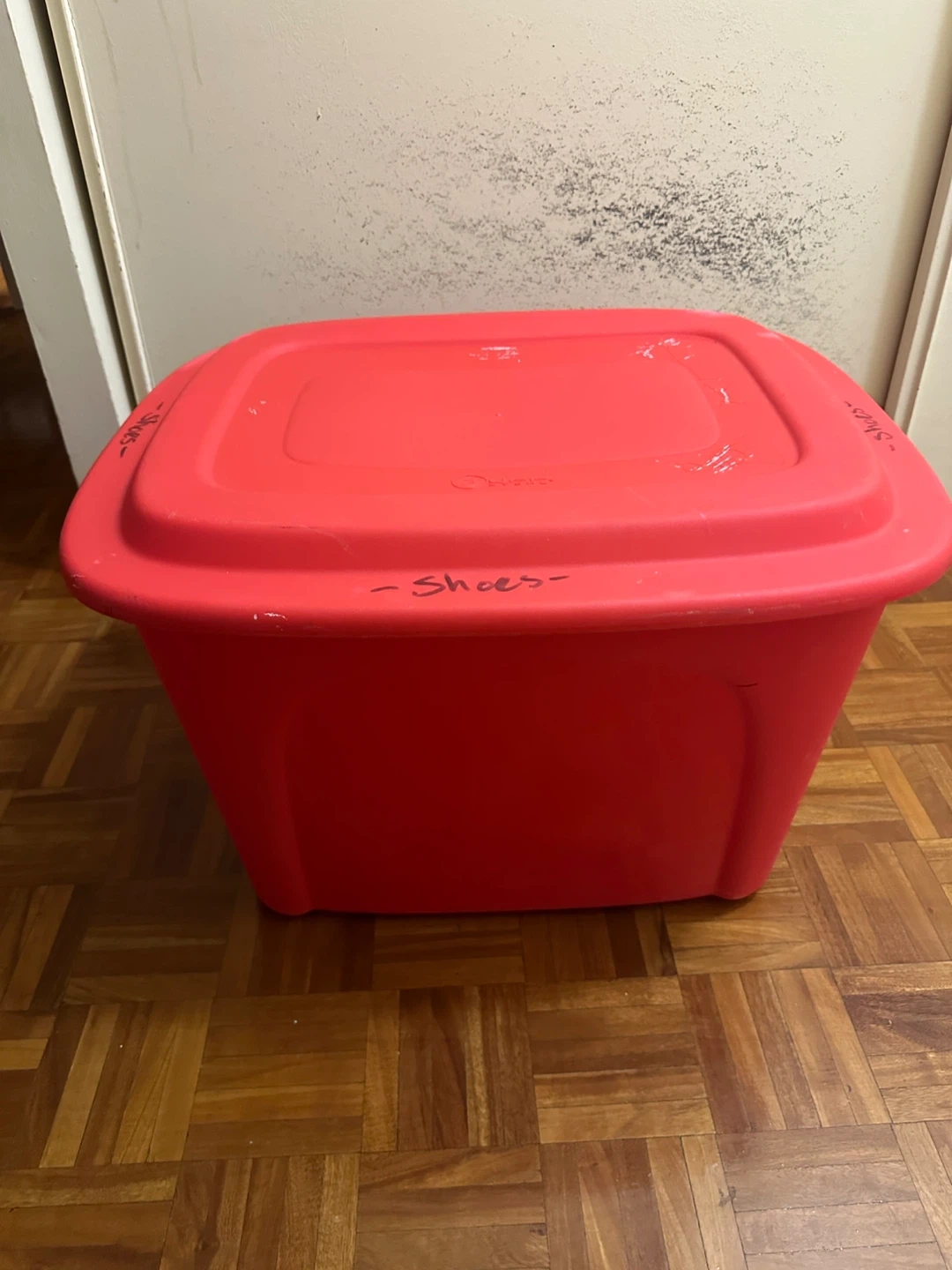 This is a red plastic storage bin. Tuff Store brand Storage box.