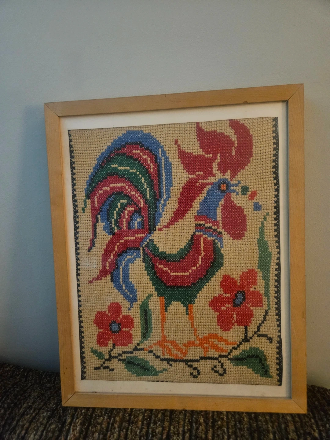 This is a charming framed cross-stitch featuring a colorful rooster and flowers. The artwork is meticulously stitched on a neutral background fabric. It's ready to add a touch of folk art to your home decor!