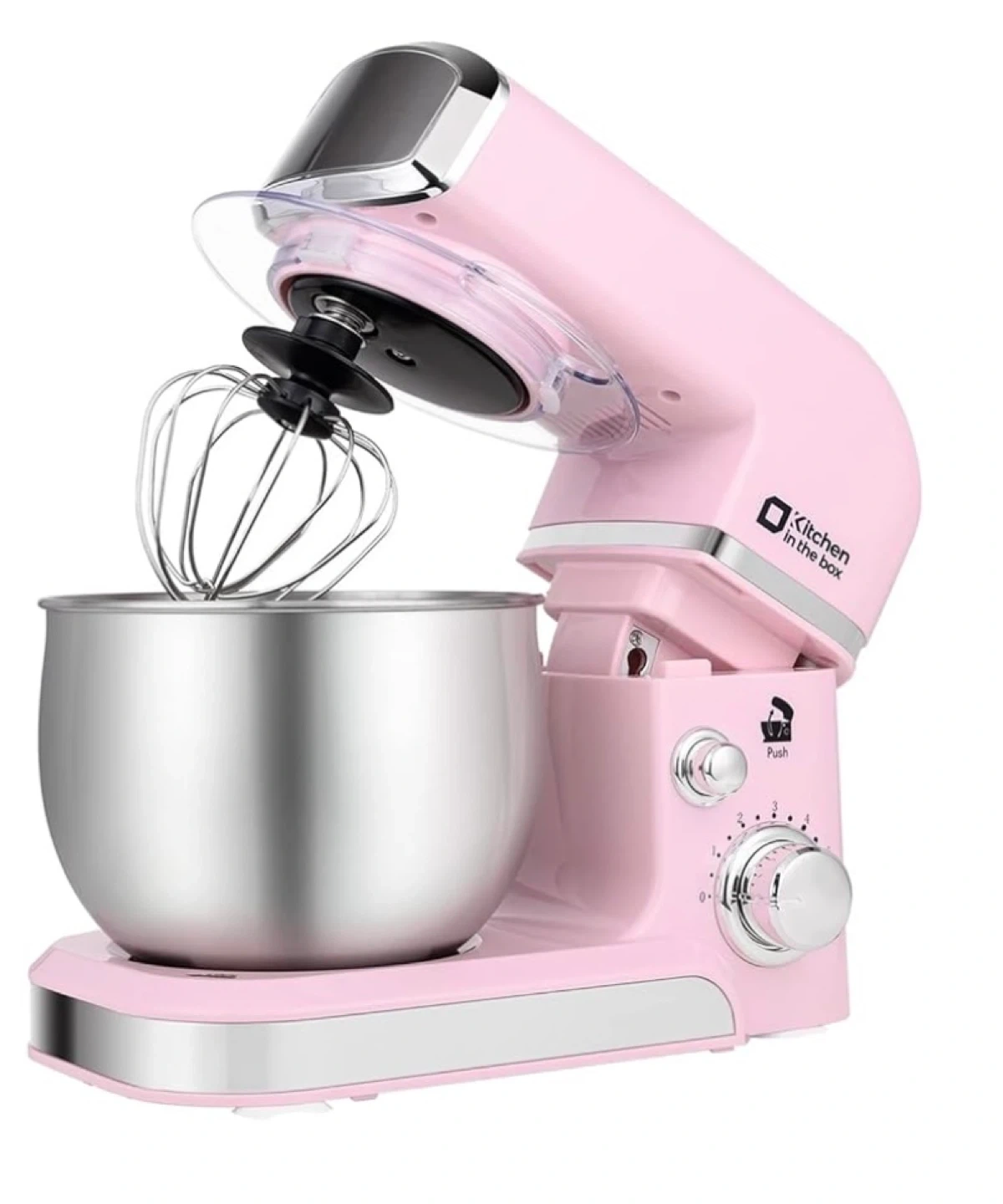 This is a hot pink stand mixer from Kitchen in the Box. It comes with a stainless steel bowl and a whisk attachment. It has multiple speed settings for various mixing needs.