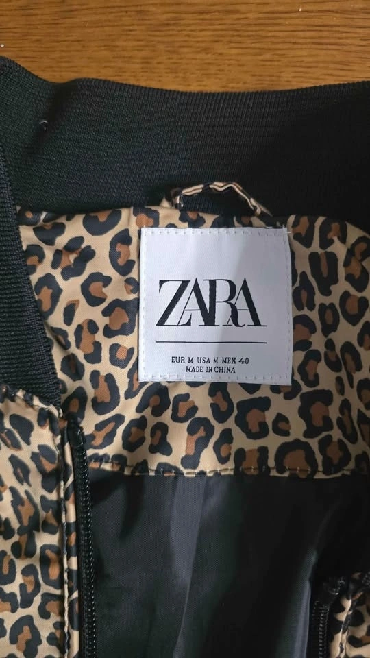 Stylish Zara bomber jacket with a cool leopard print. Features a black ribbed collar, cuffs, and hem, with black stripes on the sleeves. Full zip front and two side pockets. Size M.