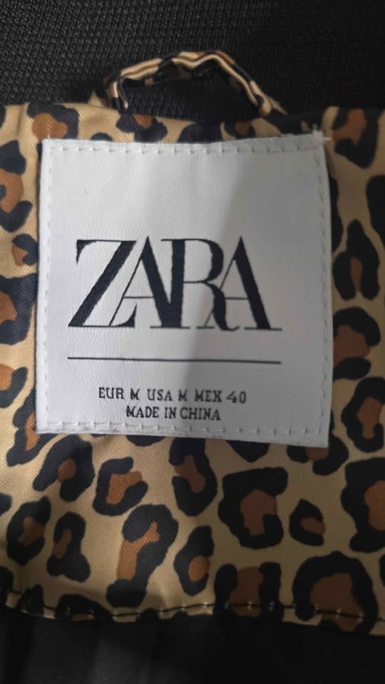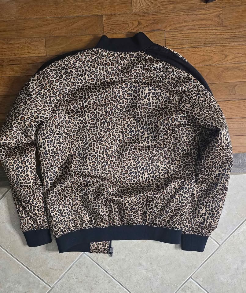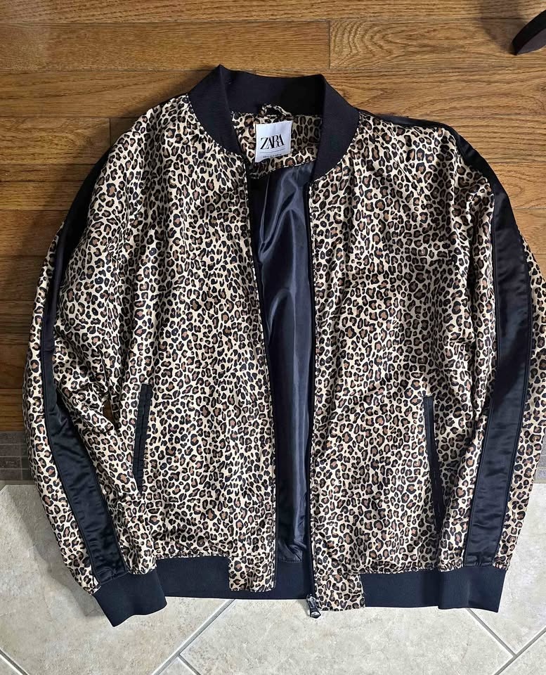 Stylish Zara bomber jacket with a cool leopard print. Features a black ribbed collar, cuffs, and hem, with black stripes on the sleeves. Full zip front and two side pockets. Size M.